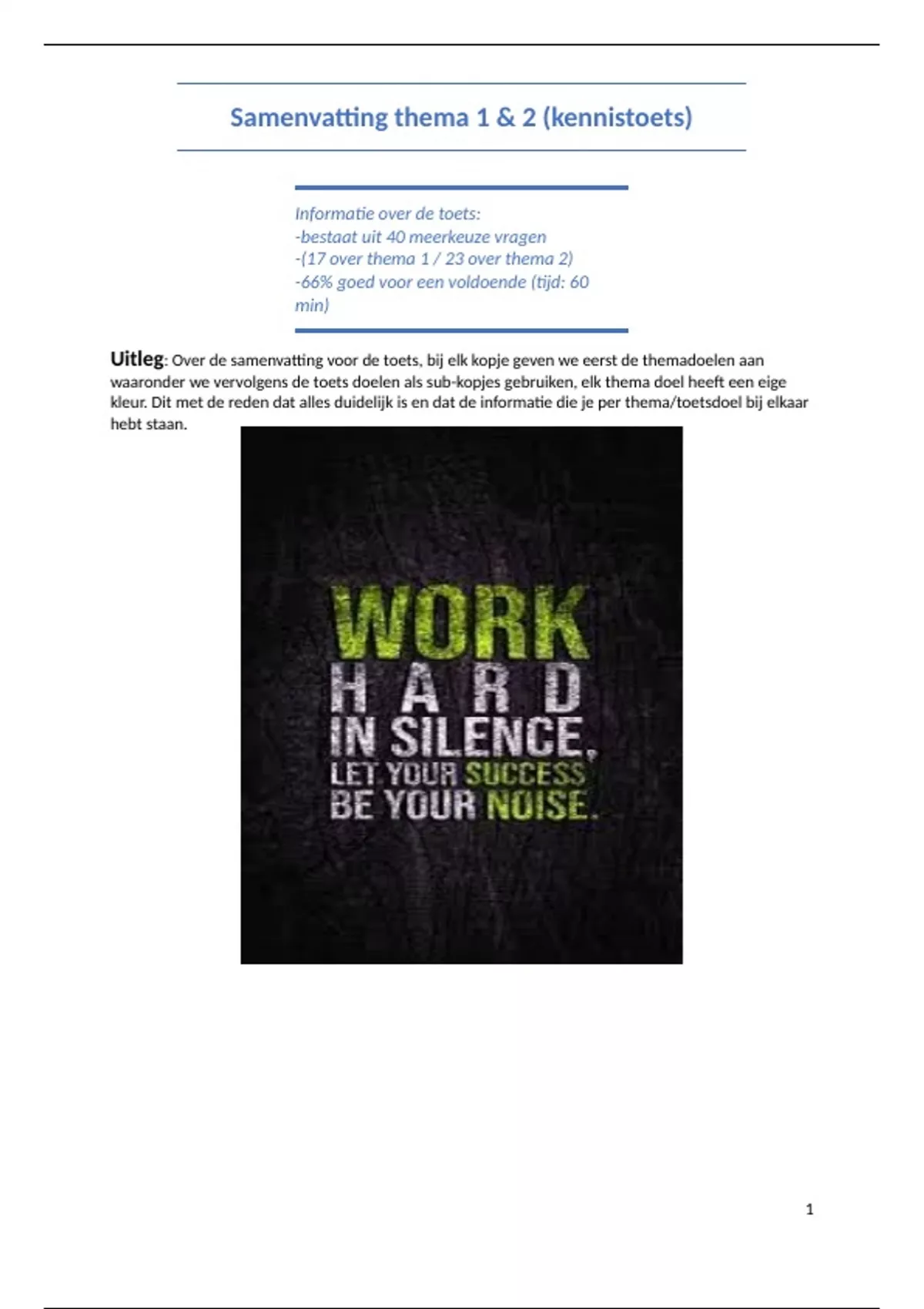 Deze samenvatting is gemaakt door drie studenten die alle benodigde informatie hebben samengevat van dit thema. De informatie komt uit lessen, colleges, kennisclips, weekdoelen, toets doelen en weekdoelen. De samenvatting is duidelijk en overzichtelijk gemaakt door het gebruik van toets doelen die alle een eigen kleur hebben.