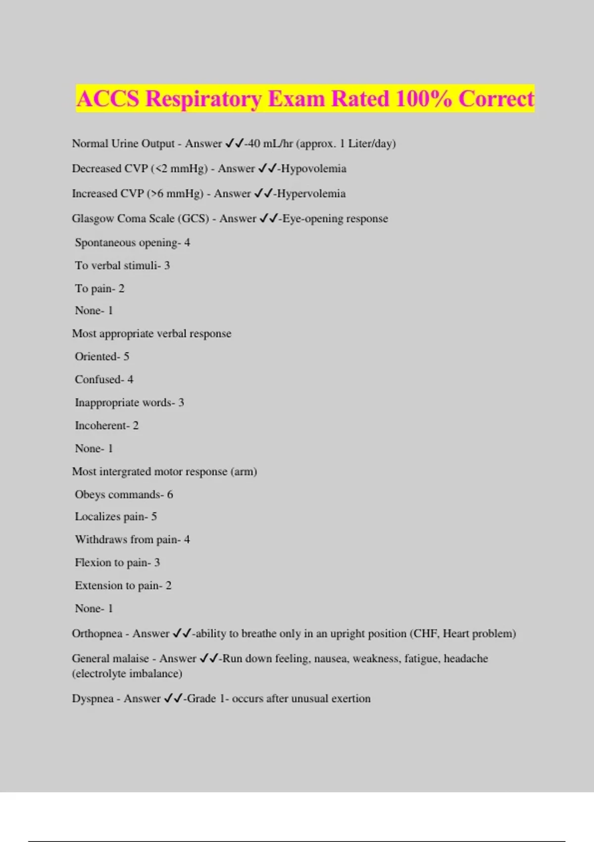 ACCS Respiratory Exam Rated 100% Correct Normal Urine Output - Answer ️️ -40 mL/hr (approx. 1 Liter/day) Decreased CVP (2 mmHg) - Answer ️️ -Hypovolemia Increased CVP (6 mmHg) - Answer ️️ -Hypervolemia Glasgow Coma Scale (GCS) - Answer ️️ -Eye-opening response Spontaneous opening- 4 To verbal stimuli- 3 To pain- 2 None- 1 Most appropriate verbal response Oriented- 5 Confused- 4 Inappropriate words- 3 Incoherent- 2 None- 1 Most intergrated motor response (arm) Obeys commands- 6 Localizes pain- 5 Withdraws from pain- 4 Flexion to pain- 3 Extension to pain- 2 None- 1 Orthopnea - Answer ️️ -ability to breathe only in an upright position (CHF, Heart problem) General malaise - Answer ️️ -Run down feeling, nausea, weakness, fatigue, headache (electrolyte imbalance) Dyspnea - Answer ️️ -Grade 1- occurs after unusual exertion Grade 2- breathless after going up hills or stairs Grade 3- while walking at normal speed Grade 4- slowly walking a short distance Grade 5- at rest, shaving, dressing, etc. vasovagal syncope - Answer ️️ -Common dizziness and fainting, caused by loss of peripheral venous tone orthostatic hypotension - Answer ️️ -Excessive drop in BP when assuming the standing position Carotid sinus syncope - Answer ️️ -Associated with hypertension carotid sinus - more common in elderly patients Cough (tussive) syncope - Answer ️️ -Transient loss of consciousness following severe coughing FUO - Answer ️️ -fever of unknown origin heart rate - Answer ️️ -60-100 bpm Respiratory rate - Answer ️️ -12-20 breaths per mi