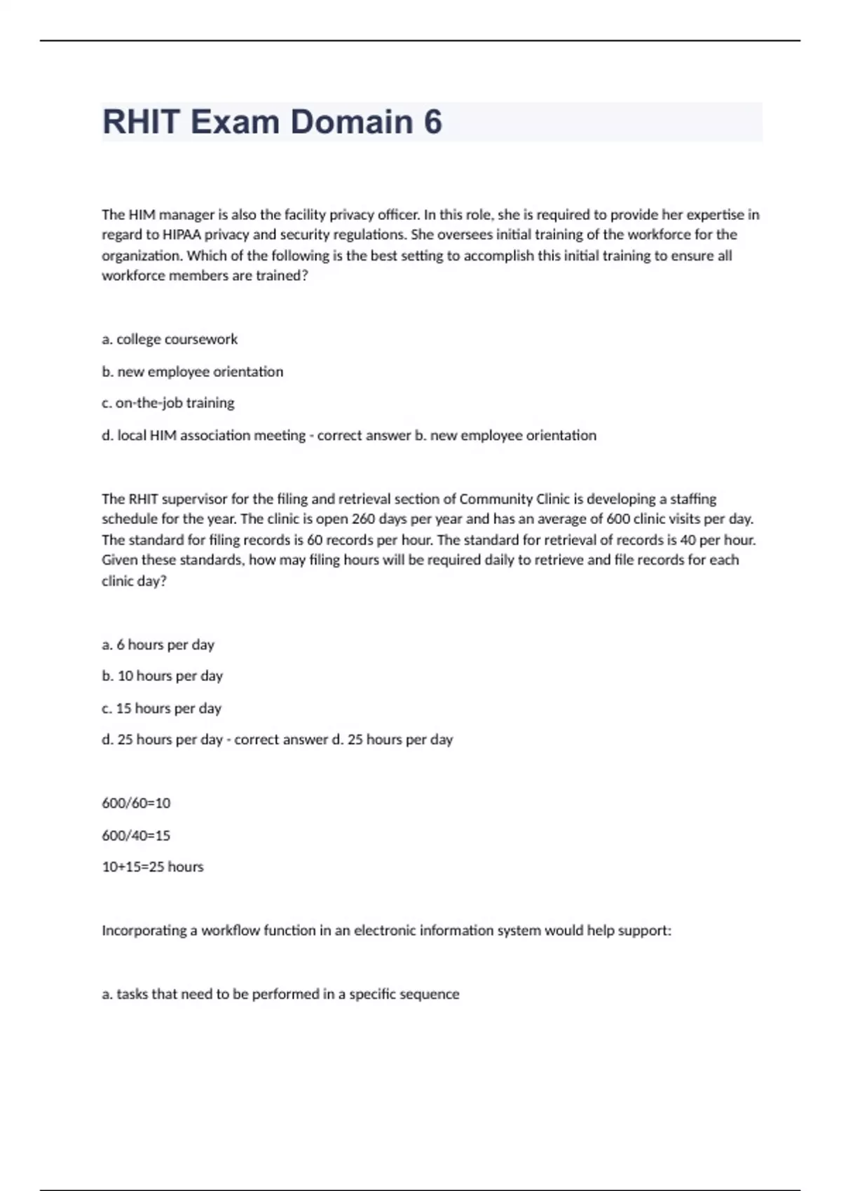 RHIT Exam Domain 6 Question and answers 100% correct solved The HIM manager is also the facility privacy officer. In this role, she is required to provide her expertise in regard to HIPAA privacy and security regulations. She oversees initial training of the workforce for the organization. Which of the following is the best setting to accomplish this initial training to ensure all workforce members are trained? a. college coursework b. new employee orientation c. on-the-job training d. local HIM association meeting - correct answer b. new employee orientation The RHIT supervisor for the filing and retrieval section of Community Clinic is developing a staffing schedule for the year. The clinic is open 260 days per year and has an average of 600 clinic visits per day. The standard for filing records is 60 records per hour. The standard for retrieval of records is 40 per hour. Given these standards, how may filing hours will be required daily to retrieve and file records for each clinic day? a. 6 hours per day