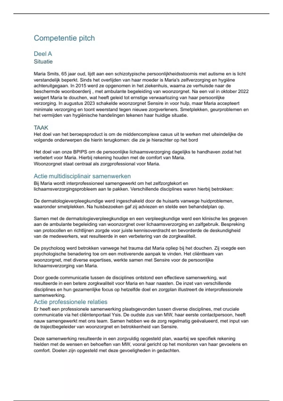 een individuele Competentie Pitch van 10 minuten individuele, methodische reflectie op het interprofessionele zorgplan (beroepsproduct). Hierbij worden de onderstaande kernbegrippen uitgewerkt: Multidisciplinaire samenwerking Professionele relatie Coördinatie van zorg Kwaliteit van zorg leveren Deskundigheidsbevordering een methodische reflectie waarin in ieder geval onderstaande aspecten aan bod komen: De rol van de student binnen het trio en in de samenwerking met andere professionals/zorgvragers. Eigen samenwerkingscompetenties. Verbeterpunten met betrekking tot de eigen samenwerkingscompetenties.