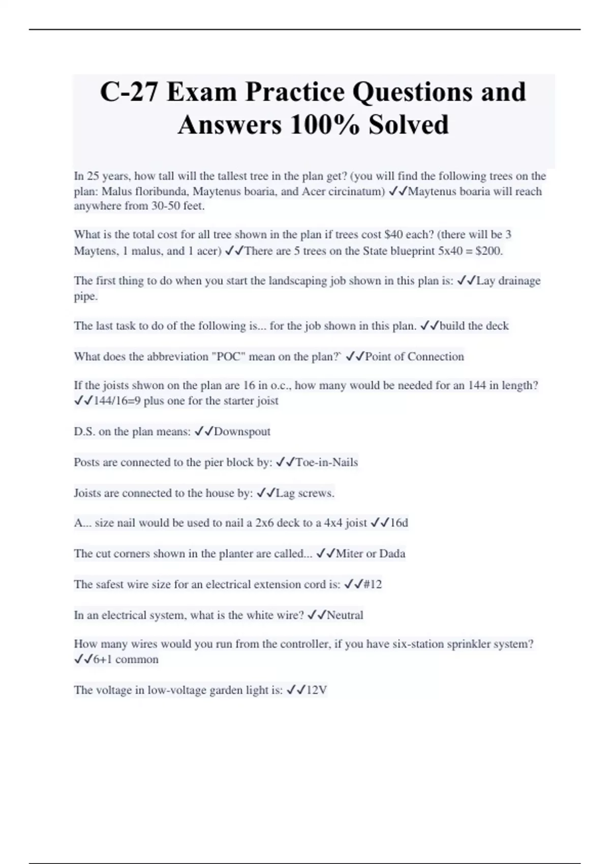 C-27 Exam Practice Questions and Answers 100% Solved In 25 years, how tall will the tallest tree in the plan get? (you will find the following trees on the plan: Malus floribunda, Maytenus boaria, and Acer circinatum) Maytenus boaria will reach anywhere from 30-50 feet. What is the total cost for all tree shown in the plan if trees cost $40 each? (there will be 3 Maytens, 1 malus, and 1 acer) There are 5 trees on the State blueprint 5x40 = $200. The first thing to do when you start the landscaping job shown in this plan is: Lay drainage pipe. The last task to do of the following is... for the job shown in this plan. build the deck What does the abbreviation "POC" mean on the plan?` Point of Connection If the joists shwon on the plan are 16 in o.c., how many would be needed for an 144 in length? 144/16=9 plus one for the starter joist D.S. on the plan means: Downspout Posts are connected to the pier block by: Toe-in-Nails Joists are connected to the house by: Lag screws. A... size nail would be used to nail a 2x6 deck to a 4x4 joist