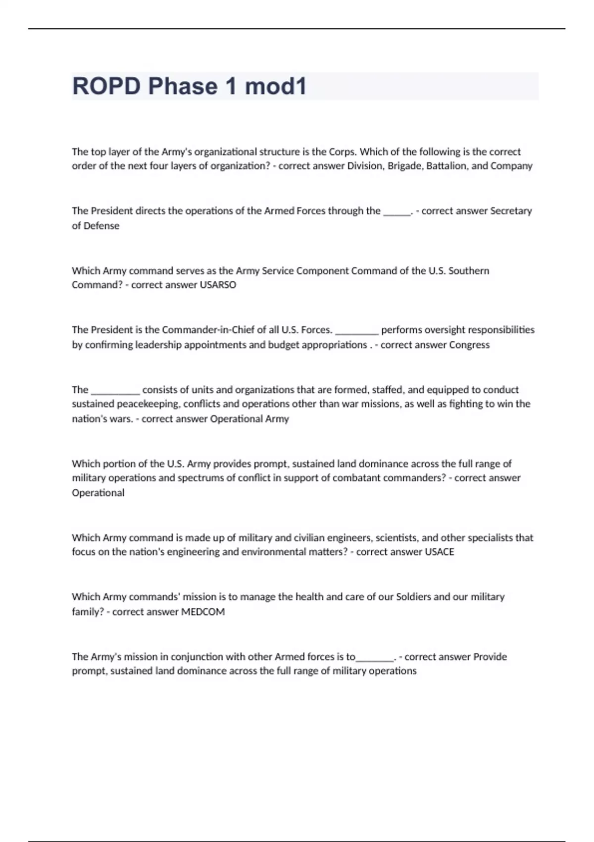 ROPD Phase 1 mod1 Questions with complete solution 2023/2024The top layer of the Army's organizational structure is the Corps. Which of the following is the correct order of the next four layers of organization? - correct answer Division, Brigade, Battalion, and Company The President directs the operations of the Armed Forces through the _____. - correct answer Secretary of Defense Which Army command serves as the Army Service Component Command of the U.S. Southern Command? - correct answer USARSO The President is the Commander-in-Chief of all U.S. Forces. ________ performs oversight responsibilities by confirming leadership appointments and budget appropriations . - correct answer Congress