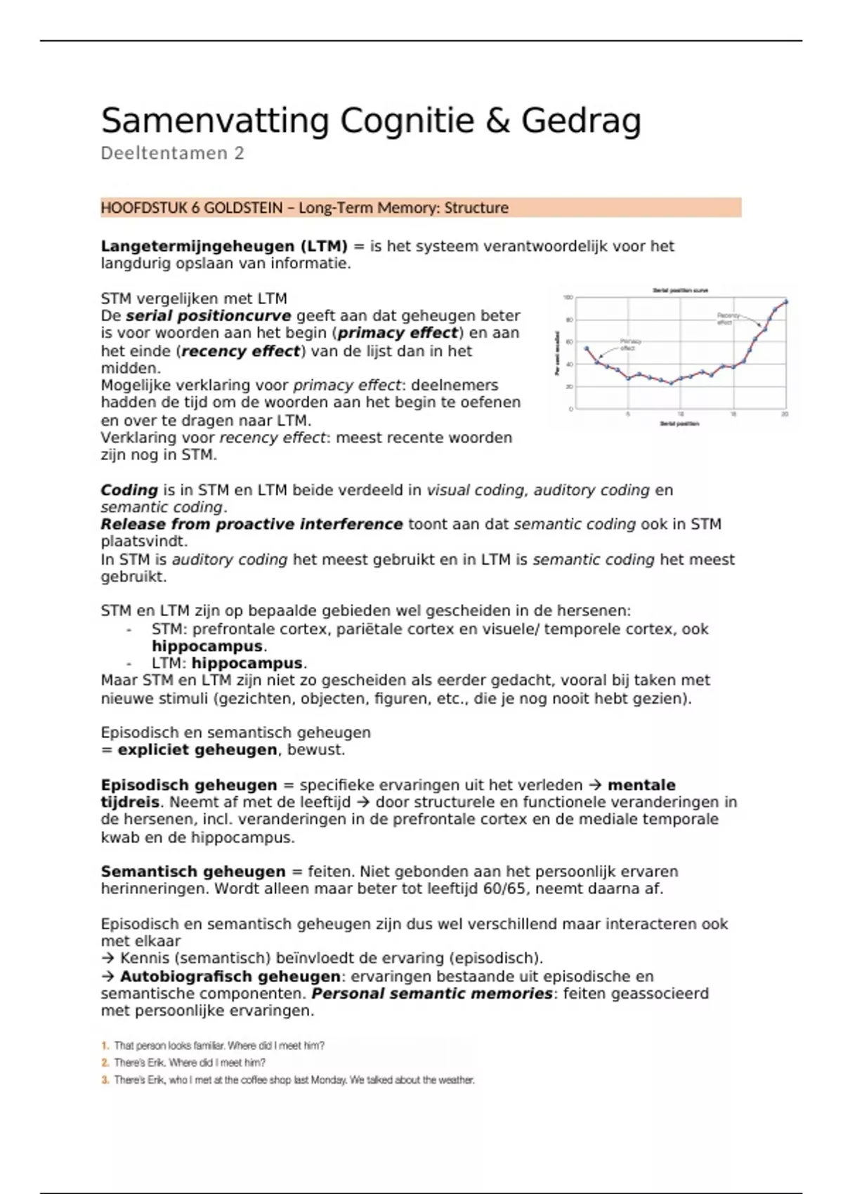 Alle stof uit het boek voor deeltentamen 2 van cognitie en gedrag bij elkaar! Hoofdstuk 6, 7, 8, 9, 11, 12, 13, van Goldstein, H12.3 van Kalat, H8 van Cacioppo, en de teksten TCP en Neuropsychologie.