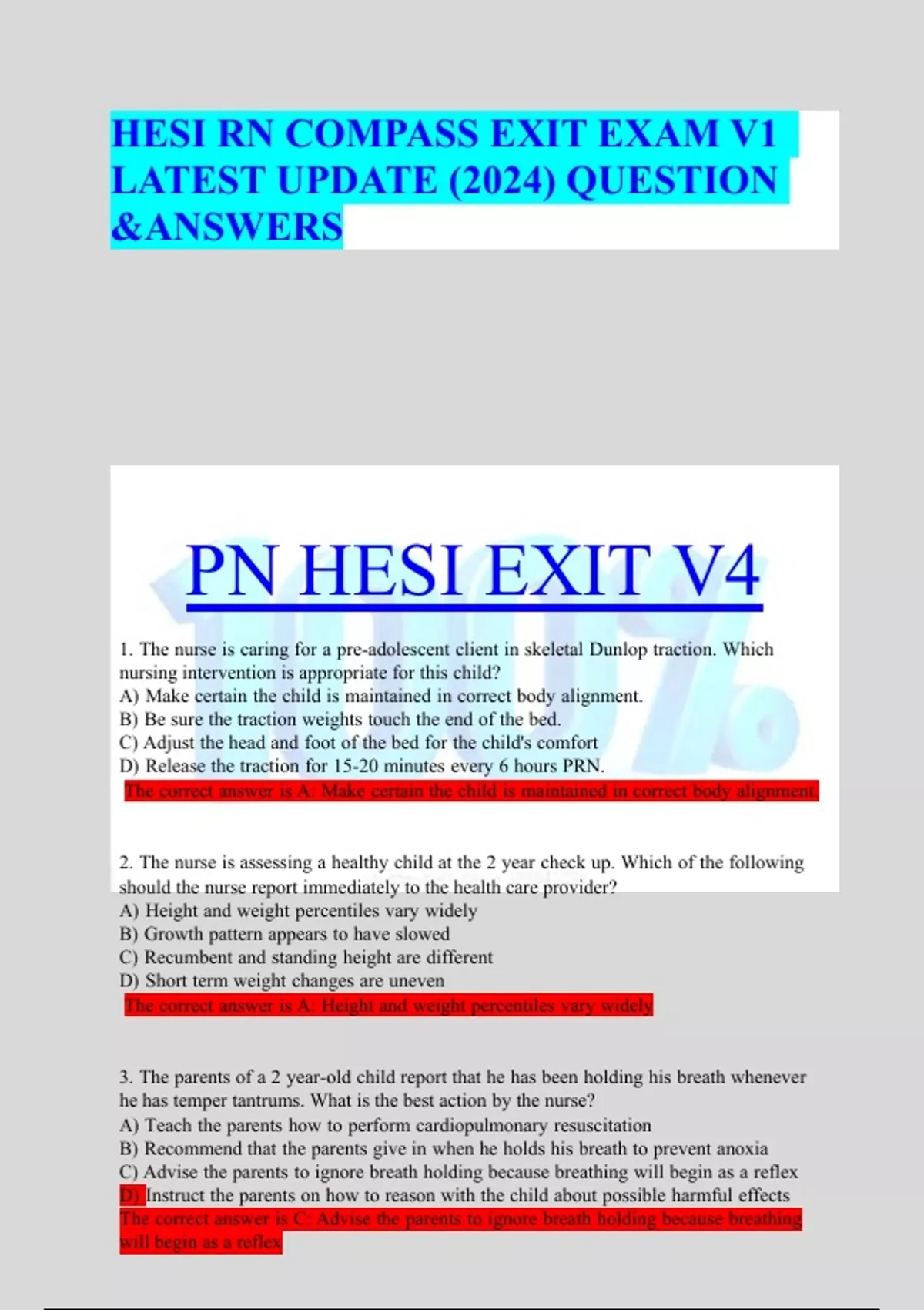 HESI RN COMPASS EXIT EXAM V1 LATEST UPDATE (2024) QUESTION &ANSWERS 1. The nurse is caring for a pre-adolescent client in skeletal Dunlop traction. Which nursing intervention is appropriate for this child? A) Make certain the child is maintained in correct body alignment. B) Be sure the traction weights touch the end of the bed. C) Adjust the head and foot of the bed for the child's comfort D) Release the traction for 15-20 minutes every 6 hours PRN. The correct answer is A: Make certain the child is maintained in correct body alignment. 2. The nurse is assessing a healthy child at the 2 year check up. Which of the following should the nurse report immediately to the health care provider? A) Height and weight percentiles vary widely B) Growth pattern appears to have slowed C) Recumbent and standing height are different D) Short term weight changes are uneven The correct answer is A: Height and weight percentiles vary widely 3. The parents of a 2 year-old child report that he has been holding his breath whenever he has temper tantrums. What is the best action by the nurse? A) Teach the parents how to perform cardiopulmonary resuscitation B) Recommend that the parents give in when he holds his breath to prevent anoxia C) Advise the parents to ignore breath holding because breathing will begin as a reflex D) Instruct the parents on how to reason with the child about possible harmful effects The correct answer is C: Advise the parents to ignore breath holding because breathing will begin as a reflex 4. The nurse is assessing a client in the emergency room. Which statement suggests that the problem is acute angina? A) "My pain is deep in my chest behind my sternum." B) "When I sit up the pain gets worse." C) "As I take a deep breath the pain gets worse." D) "The pain is right here in my stomach area." The correct answer is A: "My pain is deep in my chest behind my sternum."