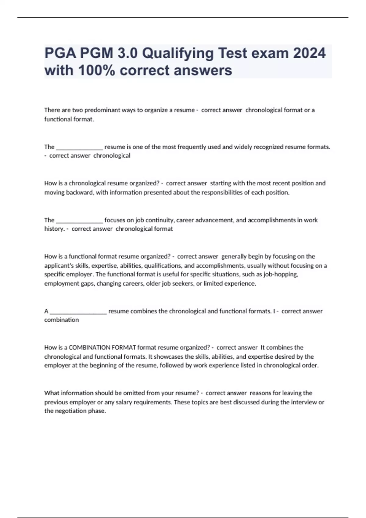 There are two predominant ways to organize a resume - correct answer chronological format or a functional format. The ______________ resume is one of the most frequently used and widely recognized resume formats. - correct answer chronological How is a chronological resume organized? - correct answer starting with the most recent position and moving backward, with information presented about the responsibilities of each position. The ______________ focuses on job continuity, career advancement, and accomplishments in work history. - correct answer chronological format How is a functional format resume organized? - correct answer generally begin by focusing on the applicant's skills, expertise, abilities, qualifications, and accomplishments, usually without focusing on a specific employer. The functional format is useful for specific situations, such as job-hopping, employment gaps, changing careers, older job seekers, or limited experience. A _________________ resume combines the chronological and functional formats. I - correct answer combination How is a COMBINATION FORMAT format resume organized? - correct answer It combines the chronological and functional formats. It showcases the skills, abilities, and expertise desired by the employer at the beginning of the resume, followed by work experience listed in chronological order. What information should be omitted from your resume? - correct answer reasons for leaving the previous employer or any salary requirements. These topics are best discussed during the interview or the negotiation phase.