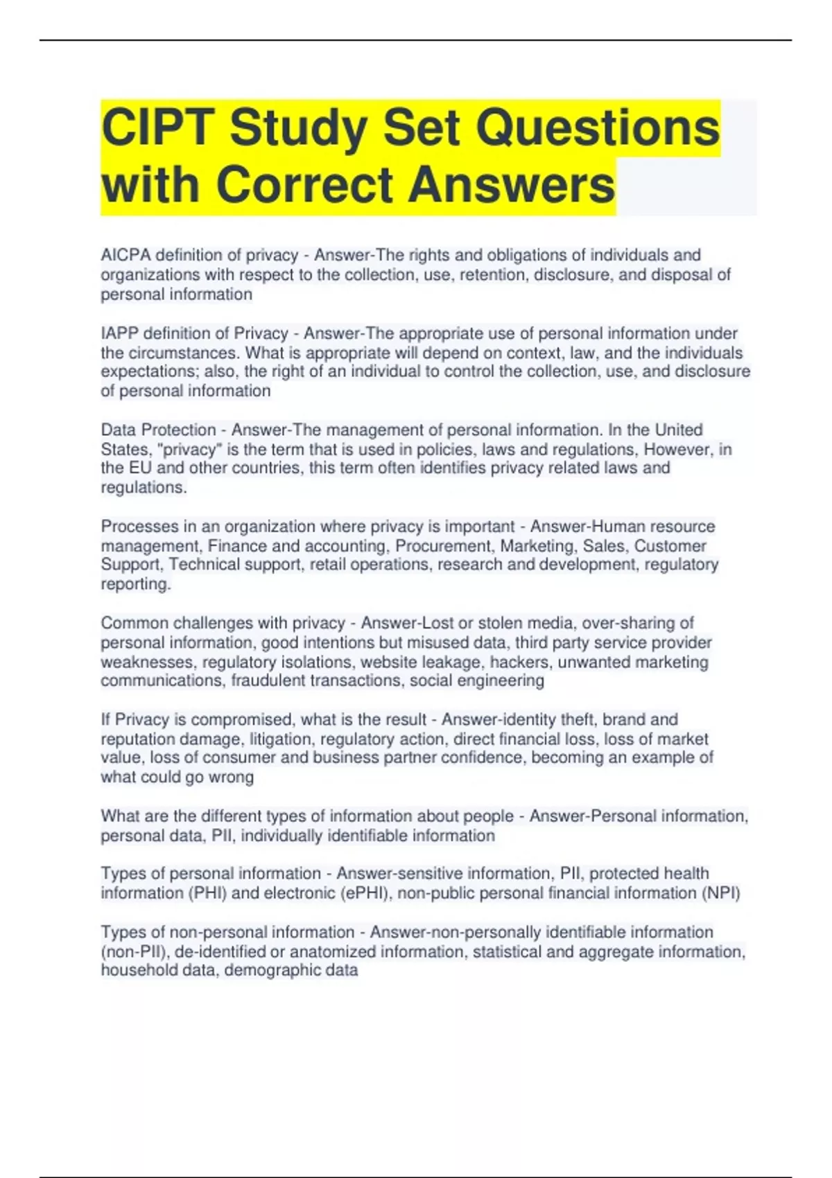 CIPT Study Set Questions with Correct Answers AICPA definition of privacy - Answer-The rights and obligations of individuals and organizations with respect to the collection, use, retention, disclosure, and disposal of personal information IAPP definition of Privacy - Answer-The appropriate use of personal information under the circumstances. What is appropriate will depend on context, law, and the individuals expectations; also, the right of an individual to control the collection, use, and disclosure of personal information Data Protection - Answer-The management of personal information. In the United States, "privacy" is the term that is used in policies, laws and regulations, However, in the EU and other countries, this term often identifies privacy related laws and regulations. Processes in an organization where privacy is important - Answer-Human resource management, Finance and accounting, Procurement, Marketing, Sales, Customer Support, Technical support, retail operations, research and development, regulatory reporting. Common challenges with privacy - Answer-Lost or stolen media, over-sharing of personal information, good intentions but misused data, third party service provider weaknesses, regulatory isolations, website leakage, hackers, unwanted marketing communications, fraudulent transactions, social engineering If Privacy is compromised, what is the result - Answer-identity theft, brand and reputation damage, litigation, regulatory action, direct financial loss, loss of market value, loss of consumer and business partner confidence, becoming an example of what could go wrong
