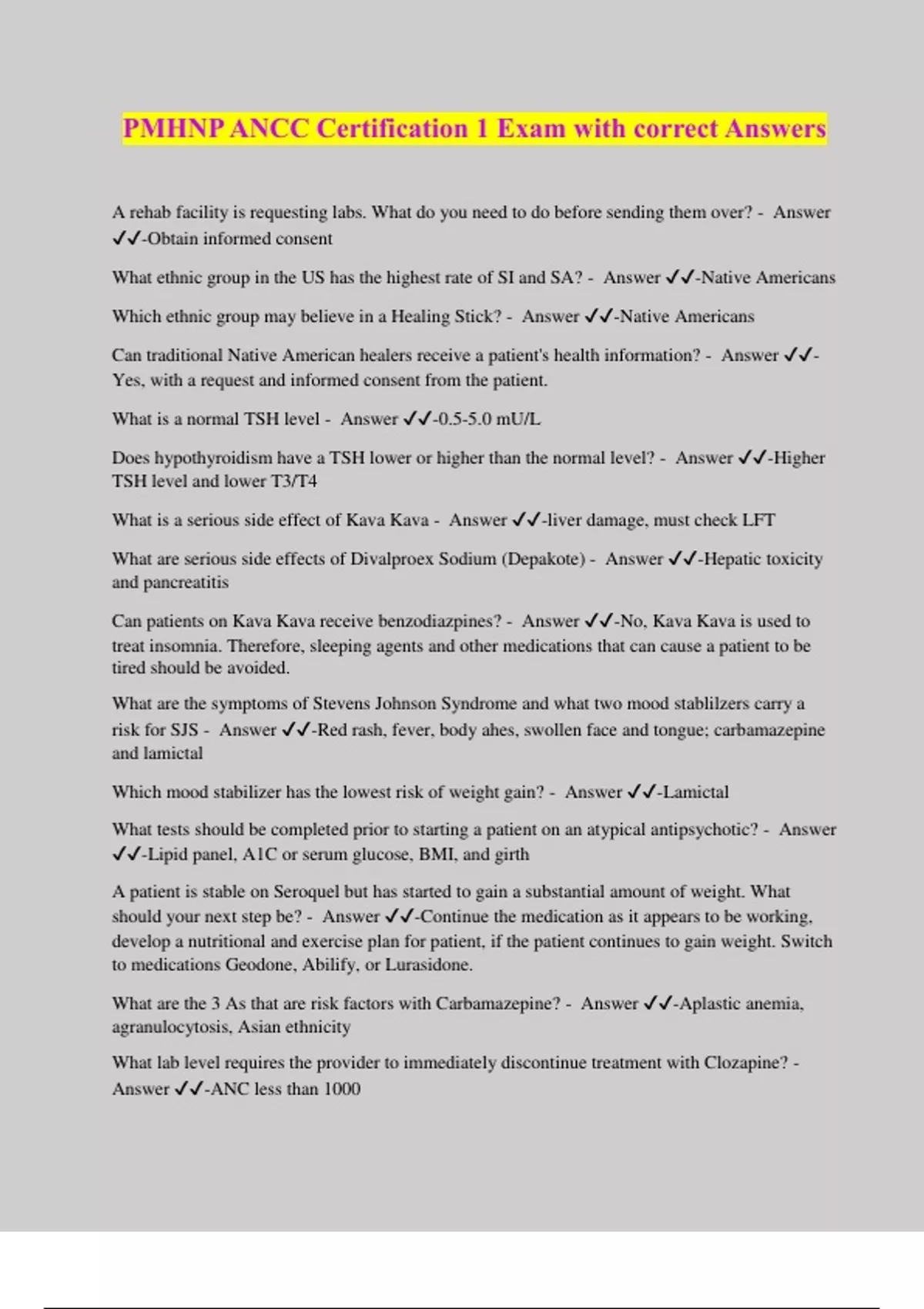 PMHNP ANCC Certification 1 Exam with correct Answers A rehab facility is requesting labs. What do you need to do before sending them over? - Answer ️️ -Obtain informed consent What ethnic group in the US has the highest rate of SI and SA? - Answer ️️ -Native Americans Which ethnic group may believe in a Healing Stick? - Answer ️️ -Native Americans Can traditional Native American healers receive a patient's health information? - Answer ️️ - Yes, with a request and informed consent from the patient. What is a normal TSH level - Answer ️️ -0.5-5.0 mU/L Does hypothyroidism have a TSH lower or higher than the normal level? - Answer ️️ -Higher TSH level and lower T3/T4 What is a serious side effect of Kava Kava - Answer ️️ -liver damage, must check LFT What are serious side effects of Divalproex Sodium (Depakote) - Answer ️️ -Hepatic toxicity and pancreatitis Can patients on Kava Kava receive benzodiazpines? - Answer ️️ -No, Kava Kava is used to treat insomnia. Therefore, sleeping agents and other medications that can cause a patient to be tired should be avoided. What are the symptoms of Stevens Johnson Syndrome and what two mood stablilzers carry a risk for SJS - Answer ️️ -Red rash, fever, body ahes, swollen face and tongue; carbamazepine and lamictal Which mood stabilizer has the lowest risk of weight gain? - Answer ️️ -Lamictal What tests should be completed prior to starting a patient on an atypical antipsychotic? - Answer ️️ -Lipid panel, A1C or serum glucose, BMI, and girth A patient is stable on Seroquel but has started to gain a substantial amount of weight. What should your next step be? - Answer ️️ -Continue the medication as it appears to be working, develop a nutritional and exercise plan for patient, if the patient continues to gain weight. Switch to medications Geodone, Abilify, or Lurasidone.
