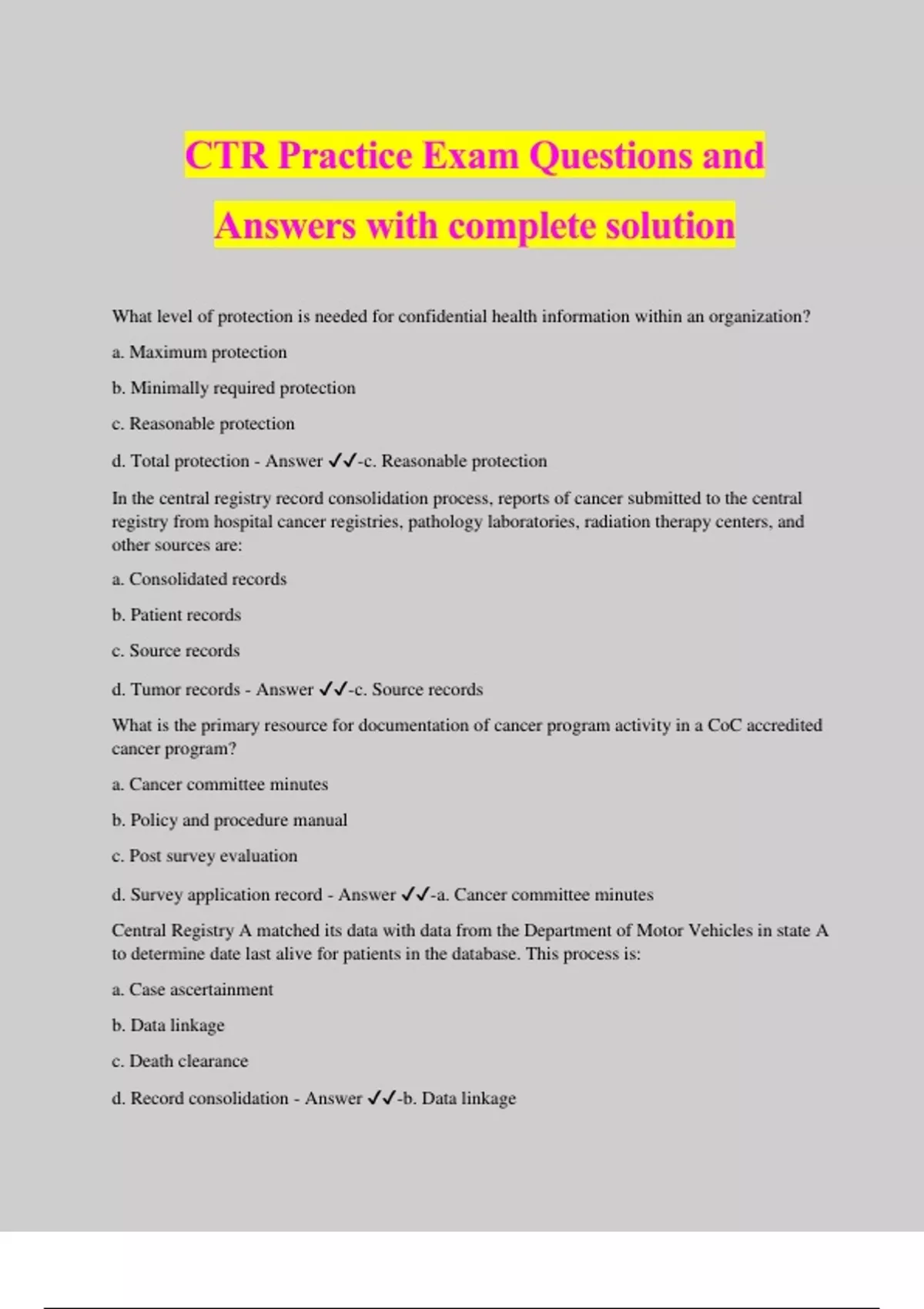 CTR Practice Exam Questions and Answers with complete solution What level of protection is needed for confidential health information within an organization? a. Maximum protection b. Minimally required protection c. Reasonable protection d. Total protection - Answer ️️ -c. Reasonable protection In the central registry record consolidation process, reports of cancer submitted to the central registry from hospital cancer registries, pathology laboratories, radiation therapy centers, and other sources are: a. Consolidated records b. Patient records c. Source records d. Tumor records - Answer ️️ -c. Source records What is the primary resource for documentation of cancer program activity in a CoC accredited cancer program? a. Cancer committee minutes b. Policy and procedure manual c. Post survey evaluation d. Survey application record - Answer ️️ -a. Cancer committee minutes Central Registry A matched its data with data from the Department of Motor Vehicles in state A to determine date last alive for patients in the database. This process is: a. Case ascertainment b. Data linkage c. Death clearance d. Record consolidation - Answer ️️ -b. Data linkage Peyer patches are often located in which organ? a. Bladder b. Brain c. Kidney d. Small intestine - Answer ️️ -d. Small intestine What is the class of case for a patient who was diagnosed and received beam radiation for painful bone metastasis at the reporting facility? a. 00 b. 14 c. 22 d. 31 - Answer ️️ -b. 14 Tumor histology is rhabdomyosarcoma. Primar