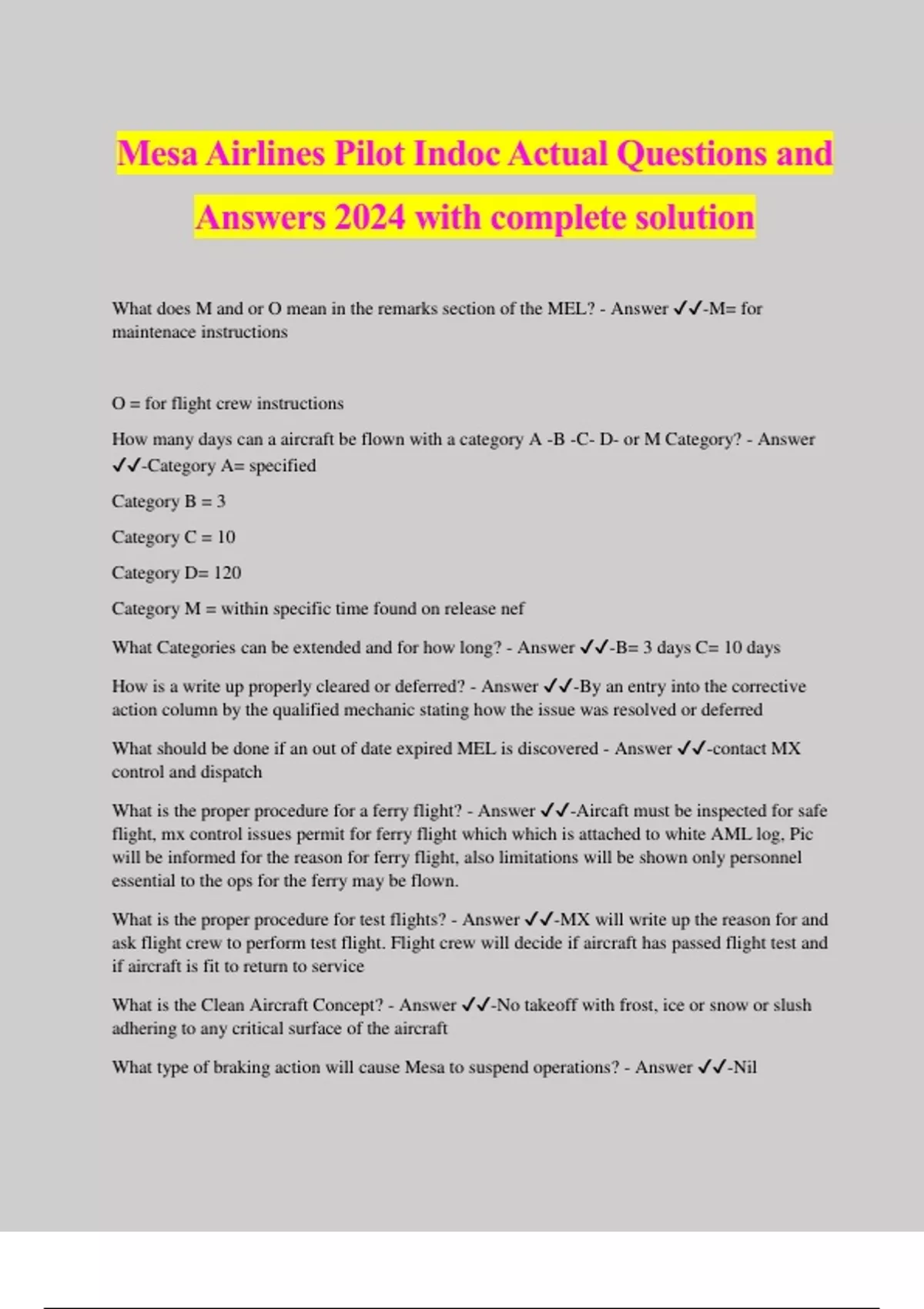 Mesa Airlines Pilot Indoc Actual Questions and Answers 2024 with complete solution What does M and or O mean in the remarks section of the MEL? - Answer ️️ -M= for maintenace instructions O = for flight crew instructions How many days can a aircraft be flown with a category A -B -C- D- or M Category? - Answer ️️ -Category A= specified Category B = 3 Category C = 10 Category D= 120 Category M = within specific time found on release nef What Categories can be extended and for how long? - Answer ️️ -B= 3 days C= 10 days How is a write up properly cleared or deferred? - Answer ️️ -By an entry into the corrective action column by the qualified mechanic stating how the issue was resolved or deferred What should be done if an out of date expired MEL is discovered - Answer ️️ -contact MX control and dispatch What is the proper procedure for a ferry flight? - Answer ️️ -Aircaft must be inspected for safe flight, mx control issues permit for ferry flight which which is attached to white AML log, Pic will be informed for the reason for ferry flight, also limitations will be shown only personnel essential to the ops for the ferry may be flown. What is the proper procedure for test flights? - Answer ️️ -MX will write up the reason for and ask flight crew to perform test flight. Flight crew will decide if aircraft has passed flight test and if aircraft is fit to return to service What is the Clean Aircraft Concept? - Answer ️️ -No takeoff with frost, ice or snow or slush adhering to any critical surface of the aircraft What type of braking action will cause Mesa to suspend operations? - Answer ️️ -Nil Describe some effects of snow , ice or frost while on the ground - Answer ️️ -Increased weight, may cause aircraft to exceed max weight limitation, create cg problems, loss of lift, increase drag, reduced controllability, loss of control, loss of critical sensing devices. What is a pre take off check? - Answer ️️ -Check of aircraft wings and critical surface areas for ice, snow frost. MUST BE CONDUCTED WITHIN THE HOLDOVER TIME cannot be done from inside the cockpit QUALIFIED de ice personnel can advice a/c/ is clear When does holdover time begin? - Answer ️️ -Upon final application of deice anti ice ends when effectiveness of fluids is lost. Mesa airlines defines marginal