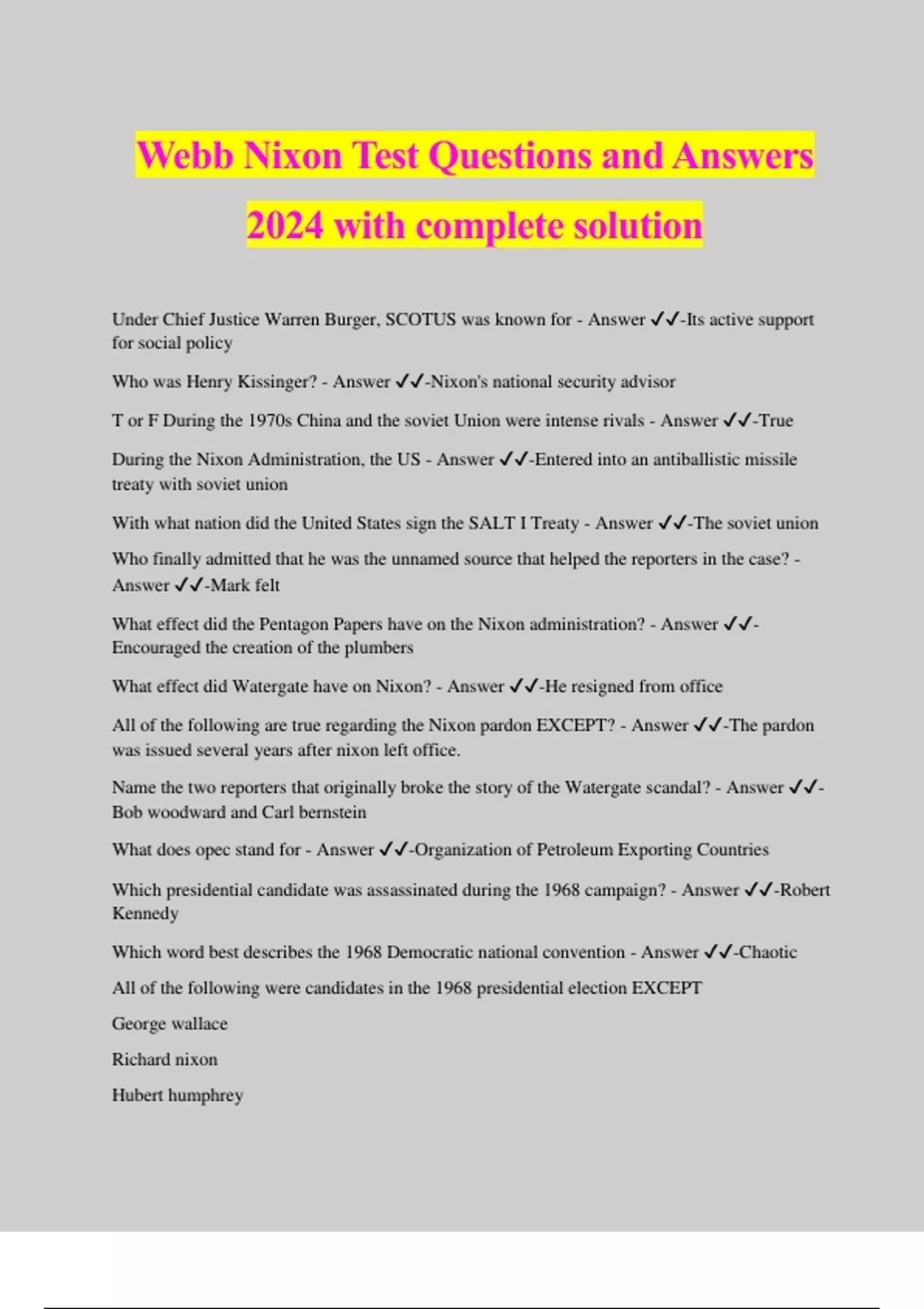 Webb Nixon Test Questions and Answers 2024 with complete solution Under Chief Justice Warren Burger, SCOTUS was known for - Answer ️️ -Its active support for social policy Who was Henry Kissinger? - Answer ️️ -Nixon's national security advisor T or F During the 1970s China and the soviet Union were intense rivals - Answer ️️ -True During the Nixon Administration, the US - Answer ️️ -Entered into an antiballistic missile treaty with soviet union With what nation did the United States sign the SALT I Treaty - Answer ️️ -The soviet union Who finally admitted that he was the unnamed source that helped the reporters in the case? - Answer ️️ -Mark felt What effect did the Pentagon Papers have on the Nixon administration? - Answer ️️ - Encouraged the creation of the plumbers What effect did Watergate have on Nixon? - Answer ️️ -He resigned from office All of the following are true regarding the Nixon pardon EXCEPT? - Answer ️️ -The pardon was issued several years after nixon left office. Name the two reporters that originally broke the story of the Watergate scandal? - Answer ️️ - Bob woodward and Carl bernstein What does opec stand for - Answer ️️ -Organization of Petroleum Exporting Countries Which presidential candidate was assassinated during the 1968 campaign? - Answer ️️ -Robert Kennedy Which word best describes the 1968 Democratic national convention - Answer ️️ -Chaotic All of the following were candidates in the 1968 presidential election EXCEPT George wallace Richard nixon Hubert humphrey