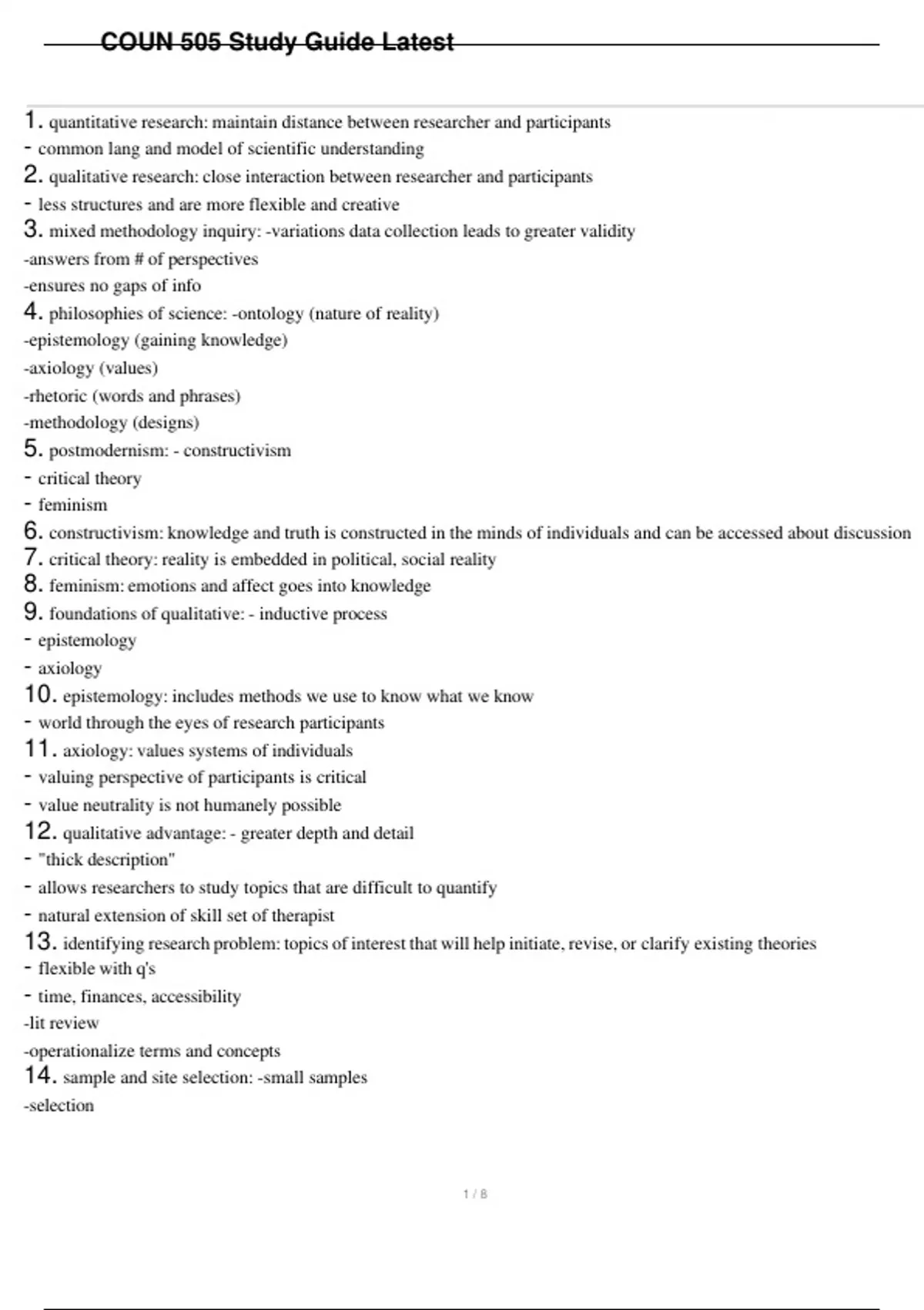 COUN 505 Study Guide Latest 1. quantitative research: maintain distance between researcher and participants - common lang and model of scientific understanding 2. qualitative research: close interaction between researcher and participants - less structures and are more flexible and creative 3. mixed methodology inquiry: -variations data collection leads to greater validity -answers from # of perspectives -ensures no gaps of info 4. philosophies of science: -ontology (nature of reality) -epistemology (gaining knowledge) -axiology (values) -rhetoric (words and phrases) -methodology (designs) 5. postmodernism: - constructivism - critical theory - feminism 6. constructivism: knowledge and truth is constructed in the minds of individuals and can be accessed about discussion 7. critical theory: reality is embedded in political, social reality 8. feminism: emotions and affect goes into knowledge 9. foundations of qualitative: - inductive process - epistemology - axiology 10. epistemology: includes methods we use to know what we know - world through the eyes of research participants 11. axiology: values systems of individuals - valuing perspective of participants is critical - value neutrality is not humanely possible 12. qualitative advantage: - greater depth and detail - "thick description" - allows researchers to study topics that are difficult to quantify - natural extension of skill set of therapist 13. identifying research problem: topics of interest that will help initiate, revise, or clarify existing theories - flexible with q's - time, finances, accessibility -lit review -operationalize terms and concepts 14. sample and site selection: -small samples -selection -voice of people not typically acknowledged -generalizability is not the goal 15. role of researcher: - how involved? - solo or team? - time away and self care 16. researcher bias: - race, age, gender - experience - personal connection to topic 17. purposive sampling: enlisting participants who can provide maximum insight and understanding of the topic under investigation 18. data collecting methods: - interviews - observation - document analysis 19. interviewing: - one to one, dyadic, groups - structures, semistructured, unstructured - focus groups 20. focus groups: gather info about attitudes, opinions, and preferences of selected groups - generate many ideas on topic and achieve consensus - useful in marketing, survey development 21. observation: natural setting, extended period of time, supplement to interview data 22. participant observer: part of the cultural or context that is being observed - large time commitment - months or years 23. document analysis: -public records - personal documents - physical materials - researcher generated documents 24. data management: - contact sheets - document summary forms 25. contact sheets: one page summary of events of the day - common themes pop up 26. document summary forms: all contact sheets put into one big summary 27. trustworthiness: - credibility - transferability - dependability - confirmability