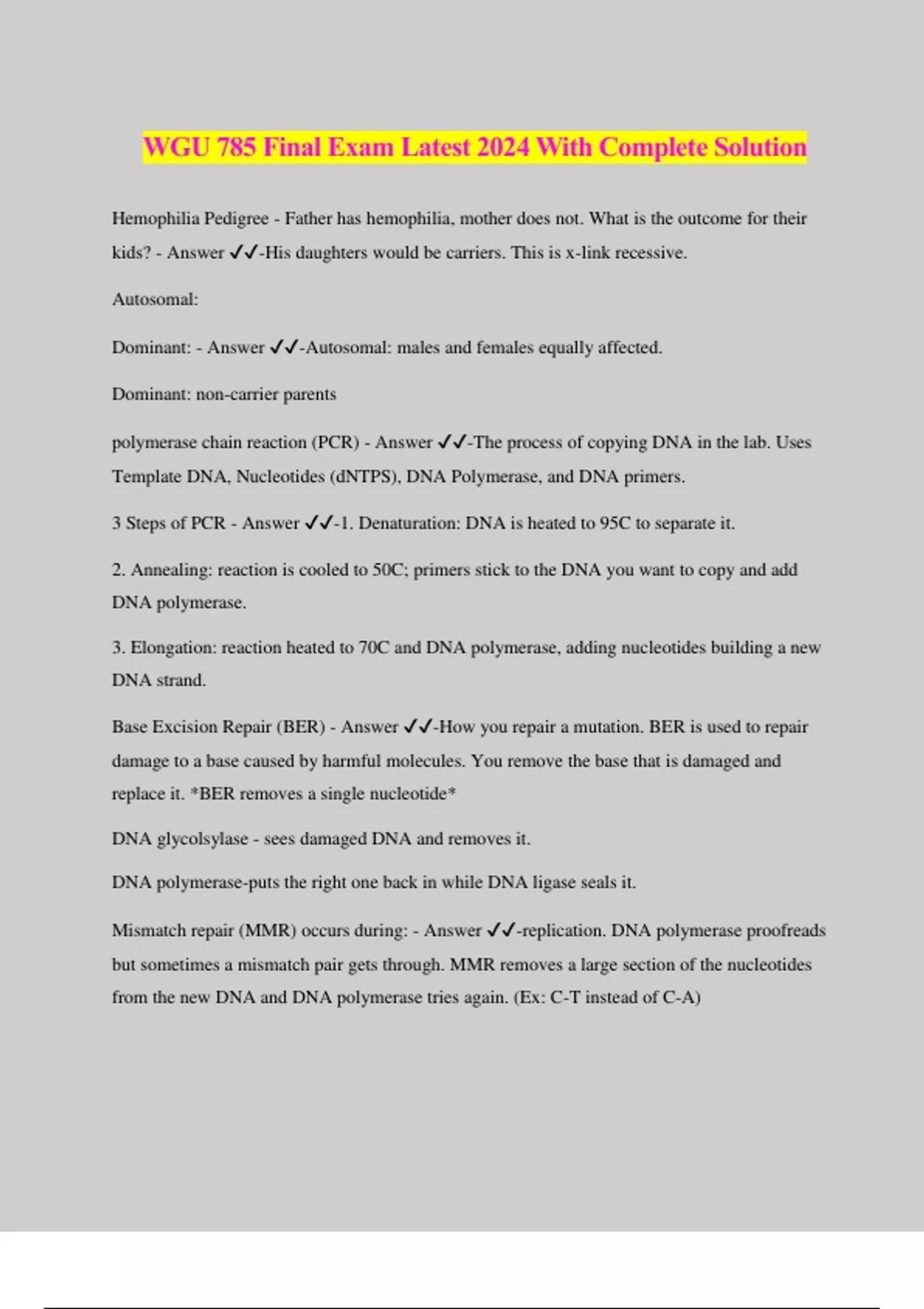 WGU 785 Final Exam Latest 2024 With Complete Solution Hemophilia Pedigree - Father has hemophilia, mother does not. What is the outcome for their kids? - Answer ️️ -His daughters would be carriers. This is x-link recessive. Autosomal: Dominant: - Answer ️️ -Autosomal: males and females equally affected. Dominant: non-carrier parents polymerase chain reaction (PCR) - Answer ️️ -The process of copying DNA in the lab. Uses Template DNA, Nucleotides (dNTPS), DNA Polymerase, and DNA primers. 3 Steps of PCR - Answer ️️ -1. Denaturation: DNA is heated to 95C to separate it. 2. Annealing: reaction is cooled to 50C; primers stick to the DNA you want to copy and add DNA polymerase. 3. Elongation: reaction heated to 70C and DNA polymerase, adding nucleotides building a new DNA strand. Base Excision Repair (BER) - Answer ️️ -How you repair a mutation. BER is used to repair damage to a base caused by harmful molecules. You remove the base that is damaged and replace it. *BER removes a single nucleotide* DNA glycolsylase - sees damaged DNA and removes it. DNA polymerase-puts the right one back in while DNA ligase seals it. Mismatch repair (MMR) occurs during: - Answer ️️ -replication. DNA polymerase proofreads but sometimes a mismatch pair gets through. MMR removes a large section of the nucleotides from the new DNA and DNA polymerase tries again. (Ex: C-T instead of C-A) Mismatch Repair corrects what kind of DNA damage? - Answer ️️ -When a base is mismatched due to errors in replication. Such as G-T instead of G-C. DNA polymerase comes by and fixes it. What happens when DNA polymerase binds to DNA to make RNA? - Answer ️️ - TRANSCRIPTION! DNA polymerase takes the individual nucleotides and matches them to the parental sequences to ensure a correct pair. It must bind with RNA primer to work. What is needed for DNA replication? - Answer ️️ -DNA polymerase Nonsense Mutation - Answer ️️ -Change in 1 nucleotide produces a STOP codon Stop= nonsense because it is no m