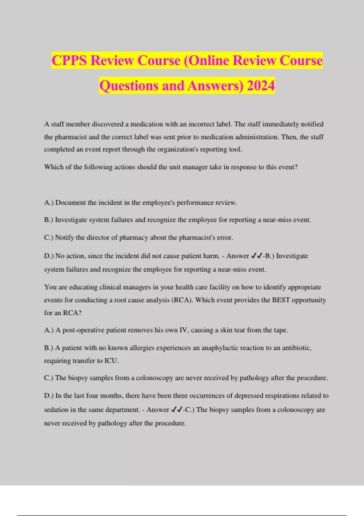 CPPS Review Course (Online Review Course Questions and Answers) 2024 A staff member discovered a medication with an incorrect label. The staff immediately notified the pharmacist and the correct label was sent prior to medication administration. Then, the staff completed an event report through the organization's reporting tool. Which of the following actions should the unit manager take in response to this event? A.) Document the incident in the employee's performance review. B.) Investigate system failures and recognize the employee for reporting a near-miss event. C.) Notify the director of pharmacy about the pharmacist's error. D.) No action, since the incident did not cause patient harm. - Answer ️️ -B.) Investigate system failures and recognize the employee for reporting a near-miss event. You are educating clinical managers in your health care facility on how to identify appropriate events for conducting a root cause analysis (RCA). Which event provides the BEST opportunity for an RCA? A.) A post-operative patient removes his own IV, causing a skin tear from the tape. B.) A patient with no known allergies experiences an anaphylactic reaction to an antibiotic, requiring transfer to ICU. C.) The biopsy samples from a colonoscopy are never received by pathology after the procedure. D.) In the last four months, there have been three occurrences of depressed respirations related to sedation in the same department. - Answer ️️ -C.) The biopsy samples from a colonoscopy are never received by pathology after the procedure. A hospital is using the AHRQ Hospital Survey on Patient Safety Culture. There were 80 employees who responded. Responses to the survey item that states "we have patient safety problems in this unit" were as follows: Strongly Agree: 16 Agree: 32 Neither Agree nor Disagree: 12 Disagree: 17 Strongly Disagree: 3 A.) 75% B.) 60% C.) 25% D.) 20% - Answer ️️ -C.) 25%The AHRQ Hospital Survey on Patient Safety Culture User Guide scoring guidance says to use the "Strongly Agree/Agree" response sum, or, for negatively worded items—such as this one—use the "Strongly Disagree/Disagree" sum. In this example, 17+3 gives us the response sum (i.e., 20), which we divide by total number of respondents (i.e., 80): 20/80 = 25%. What is one example of a communication technique providers can use to improve communication with patients? A.) SBAR B.) Teach-back C.) CUSP D.) Two-Challenge Rule - Answer ️️ -B.) Teach-back The Impact of Organizational Change on Safety What are the three steps to managing patient safety through organizational change? A.) Monitor change, identify potential safety implications, and employ countermeasures to mitigate any anticipated risks B.) Employ countermeasures to mitigate any anticipated risks, monitor change C.) Identify potential safety implications, employ countermeasures to mitigate any anticipated risks, and monitor the change D.) None of the above - Answer ️️ -C.) Identify potential safety implications, employ countermeasures to mitigate any anticipated risks, and monitor the change What is the term which describes the belief that one will not be punished or humiliated for speaking up with ideas, questions, concerns, or mistakes? - Answer ️️ -Psychological safety A safety-supportive system of shared accountability in which: 1.) Healthcare institutions are accountable for safe systems design and for encouraging safe choices of clinicians and staff (clear expectations set the tone to create environment of mutual respect) 2.) Clinicians and staff are accountable for the quality of their choices (i.e. striving to make the best possible choices as professionals) - Answer ️️ -Just Culture At the conclusion of a surgical procedure at your hospital, the instrument count is incorrect. The hospital policy does not stipulate that the surgeon must remain on the premises until an x-ray is obtained to check for retained foreign objects. By the time the x-ray results come in to reveal that there is, in fact, a retained instrument, the original surgeon has left the hospital to catch a flight. Another surgeon is contacted to remove the retained instrument. How should leadership respond to this event? A.) Revise the hospital policy to make it clear that surgeons must stay in the operating room (OR) until instrument count issues are resolved. B.) Using an appropriate accountability system, counsel the surgeon about customary clinical standards. C.) Re-educate the OR nursing staff on keeping track of instruments on the sterile field. D.) Create a process map of how instruments are managed during surgery, looking f - Answer ️️ -B.) Using an appropriate accountability system, counsel the surgeon about customary clinical standards. This term reflects a group of individuals who understand the importance of self- and group- regulation. - Answer ️️ -Professionalism The human resources department at your organization has asked your patient safety specialist for recommendations on new policies to help support safety culture. Which recommendation sounds best? A.) Sending human resources all event data so that they can record involvement in adverse events in personnel files B.) Including human resources in all root cause analyses so that they can provide guidance on recommended training updates for staff C.) Implementing routine use of a tool to determine which events are attributed to human error, at-risk behavior, and reckless behavior D.) Implementing routine use of a tool to determine which events are attributed to human error, at-risk behavior, and reckless behavior AND consulting with human resources on at-risk and reckless behavior cases - Answer ️️ -D.) Implementing routine use of a tool to determine which events are attributed to human error, at-risk behavior, and reckless behavior AND consulting with human resources on at-risk and reckless beha