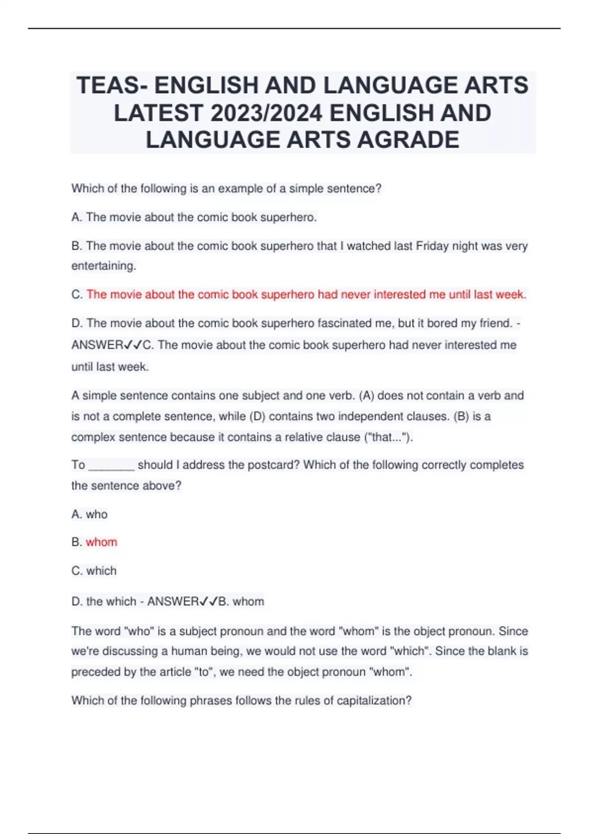 TEAS- ENGLISH AND LANGUAGE ARTS LATEST ENGLISH AND LANGUAGE ARTS AGRADE