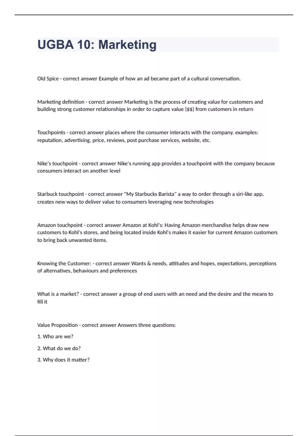 UGBA 10 Marketing Question and answers already passed 2023/2024Old Spice - correct answer Example of how an ad became part of a cultural conversation. Marketing definition - correct answer Marketing is the process of creating value for customers and building strong customer relationships in order to capture value ($$) from customers in return Touchpoints - correct answer places where the consumer interacts with the company. examples: reputation, advertising, price, reviews, post purchase services, website, etc. Nike's touchpoint - correct answer Nike's running app provides a touchpoint with the company because consumers interact on another level Starbuck touchpoint - correct answer "My Starbucks Barista" a way to order through a siri-like app, creates new ways to deliver value to consumers leveraging new technologies Amazon touchpoint - correct answer Amazon at Kohl's: Having Amazon merchandise helps draw new customers to Kohl's stores, and being located inside Kohl's makes it easier for current Amazon customers to bring back unwanted items. Knowing the Customer: - correct answer Wants & needs, attitudes and hopes, expectations, perceptions of alternatives, beha