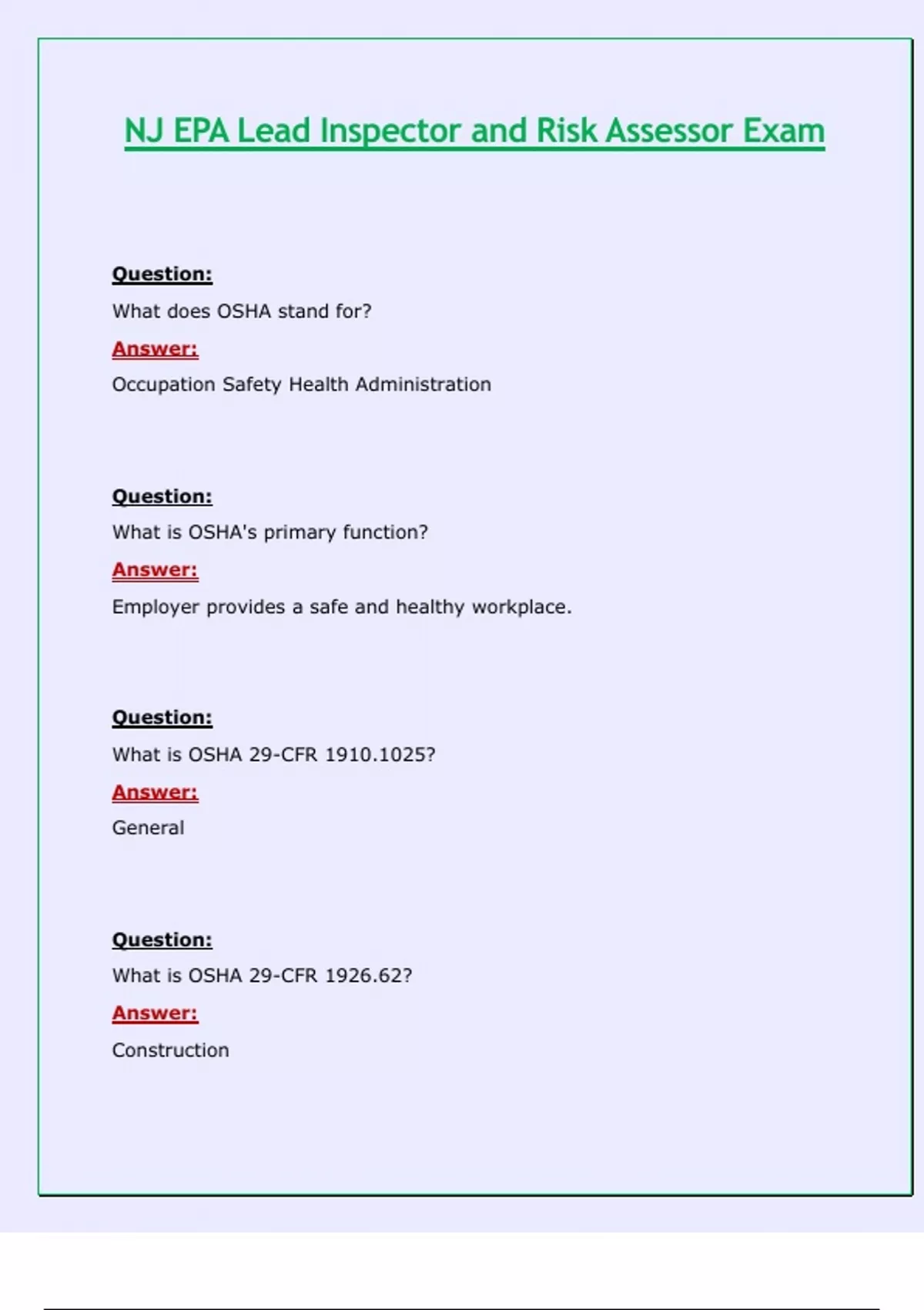 NJ Environmental Protection Agency (EPA) Lead Inspector and Risk Assessor Exam Questions and Answers
