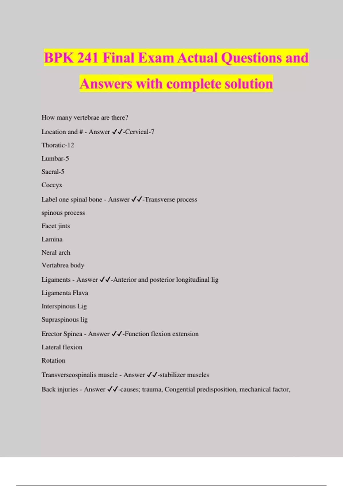 BPK 241 Final Exam Actual Questions and Answers with complete solution How many vertebrae are there? Location and # - Answer ️️ -Cervical-7 Thoratic-12 Lumbar-5 Sacral-5 Coccyx Label one spinal bone - Answer ️️ -Transverse process spinous process Facet jints Lamina Neral arch Vertabrea body Ligaments - Answer ️️ -Anterior and posterior longitudinal lig Ligamenta Flava Interspinous Lig Supraspinous lig Erector Spinea - Answer ️️ -Function flexion extension Lateral flexion Rotation Transverseospinalis muscle - Answer ️️ -stabilizer muscles Back injuries - Answer ️️ -causes; trauma, Congential predisposition, mechanical factor, Effects; Pain, tenderness, spasms, restricted ROM Neurologic SSx Radiating pain, scratch, weakness, numbness, absent Back strains and sprains - Answer ️️ -Common (twisting, lifting) Recurrence is common ssx Pain, tenderness, Resticted ROM, Increased warmth If any neurological ssx, assume fracture or dislocation ( go to hospital immediately) Treatment for strains and spains in the back - Answer ️️ -Rest supine 2 days max NSAID cold therapy heat therapy physiotherapy Intervertebral disc disease - Answer ️️ -Mechanisms; Strains or sprains herniation of nucleus pulpous Compression of nerve roots or spina cord Effects; instablility osteoarthritis SSx same as strain or sprains Tx Conservative if possible Surgical Management of back injuries - Answer ️️ -Key is balance -functional capacity -realistic goals Main stays - Time - Cold, Heat, NSAID, Braces -Physiotherapy, massage therapy - Change in job or sport Stinger or Burner - Answer ️️ -Stretches brachial
