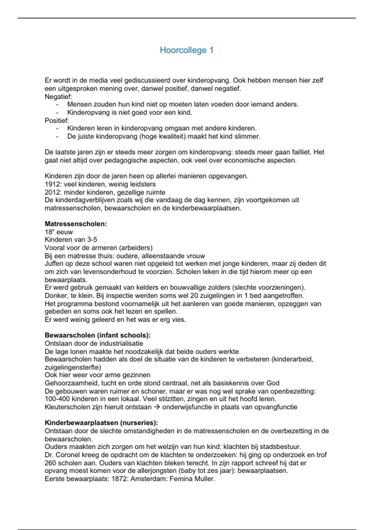 Aantekeningen van colleges 1 t/m 4 van het vak Professionele Kinderopvang