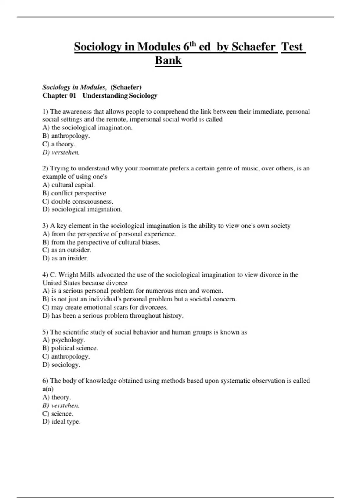 Sociology in Modules 6 th ed by Schaefer Test Bank Sociology in Modules, (Schaefer) Chapter 01 Understanding Sociology 1) The awareness that allows people to comprehend the link between their immediate, personal social settings and the remote, impersonal social world is called A) the sociological imagination. B) anthropology. C) a theory. D) verstehen. 2) Trying to understand why your roommate prefers a certain genre of music, over others, is an example of using one's A) cultural capital. B) conflict perspective. C) double consciousness. D) sociological imagination. 3) A key element in the sociological imagination is the ability to view one's own society A) from the perspective of personal experience. B) from the perspective of cultural biases. C) as an outsider. D) as an insider. 4) C. Wright Mills advocated the use of the sociological imagination to view divorce in the United States because divorce A) is a serious personal problem for numerous men and women. B) is not just an individual's personal problem but a societal concern. C) may create emotional scars for divorcees. D) has been a serious problem throughout history. 5) The scientific study of social behavior and human groups is known as A) psychology. B) political science. C) anthropology. D) sociology. 6) The body of knowledge obtained using methods based upon systematic observation is called a(n) A) theory. B) verstehen. C) science. D) ideal type. 7) Sociology is considered a science because sociologists A) teach at respected universities. B) engage in organized and systematic study of phenomena to enhance understanding. C) receive government funding for research projects. D) construct middle-range theories to explain social behavior. 8) Sociology, anthropology, economics, and history are fields within the A) natural sciences. B) social sciences. C) medical sciences. D) humanities. 9) Which of the following academic disciplines emphasizes the influence that society has on people's attitudes and behavior and the ways in which people shape society? A) Anthropology B) Economics C) Sociology D) Physics 10) Which social science would be interested in studying individual cases of emotional stress among workers, investors, and business owners? A) History B) Economics C) Sociology D) Psychology 11) A social scientist would be likely to study the A) composition of a meteorite discovered in a remote area of Siberia. B) reasons for the decreasing divorce rate in the U.S. C) newest procedure in heart transplant surgery. D) possibility of life on Mars. 12) Sociologists argue that, unlike scientific knowledge, common sense conclusions are not A) published. B) reliable. C) politically correct. D) easily disseminated. 13) An attempt to explain problems, actions, or behavior in a comprehensive manner is called a(n) A) science. B) typology. C) theory. D) ideal type. 14) In Émile Durkheim's study of suicide, he related suicide rates to A) personal depression. B) personal stress. C) the extent to which people were integrated into the group life of a society. D) climatic conditions such as oppressive heat, heavy rain, and cold winters. 15) Émile Durkheim's explanation of suicide was scientific because he A) developed conclusions based on a systematic examination of data. B) carefully studied the personalities of hundreds of suicide victims. C) worked in a university setting. D) divided suicide into four distinctive categories. 16) Émile Durkheim is known for his classic sociological study of A) suicide. B) abortion. C) soccer. D) crowd control. 17) The discipline of sociology was given its name by the French theorist A) Émile Durkheim. B) Auguste Comte. C) Harriet Martineau. D) Marcel Marceau. 18) Which sociologist translated the works of Auguste Comte into English and emphasized the impact the economy, laws, trade, and population could have on contemporary social problems? A) Émile Durkheim B) Jane Addams C) Harriet Martineau D) Talcott Parsons 19) Which early sociologist applied the concept of evolution to societies in order to explain how they change or evolve over time? A) Émile Durkheim B) Charles Darwin C) Harriet Martineau D) Herbert Spencer 20) Anomie refers to a A) model that serves as a measuring rod against which actual cases can be evaluated. B) loss of direction that is felt in a society when social control of individual behavior has become ineffective. C) classification scheme containing two or more categories. D) type of suicide that is based on depression. 21) The concept of anomie was introduced into sociology by A) Auguste Comte. B) Émile Durkheim. C) Max Weber. D) C. Wright Mills. 22) The word(s) that Max Weber used to stress the need for sociologists to take into account people's emotions, thoughts, beliefs, understandings, and attitudes was A) verstehen. B) cultural capital. C) anomie. D) social capital. 23) A sociologist interviews high-salaried corporate chief executive officers (CEOs) to discover whether they feel stress in their everyday lives as a result of the pressure to produce at an unrealistic level. This sociologist is employing A) alienation. B) anomie. C) verstehen. D) globalization techniques. 24) An ideal type is a(n) A) body of knowledge obtained by methods based on systematic observation. B) construct or model that serves as a measuring rod against which actual cases can be evaluated. C) detailed plan or method for obtaining data scientifically. D) initiator of people's attitudes or behavior. 25) A sociology instructor asks students to make lists of the characteristics of the best and worst possible instructors. These lists, which would be used to evaluate all instructors, would form an example of a(n) A) typology. B) ideal type. C) verstehen. D) hypothesis. 26) In The Communist Manifesto, Marx argued that the working class must A) ally with capitalists to build a better world. B) try to work toward a return to feudalism. C) overthrow the existing class system of capitalist societies. D) ignore all aspec