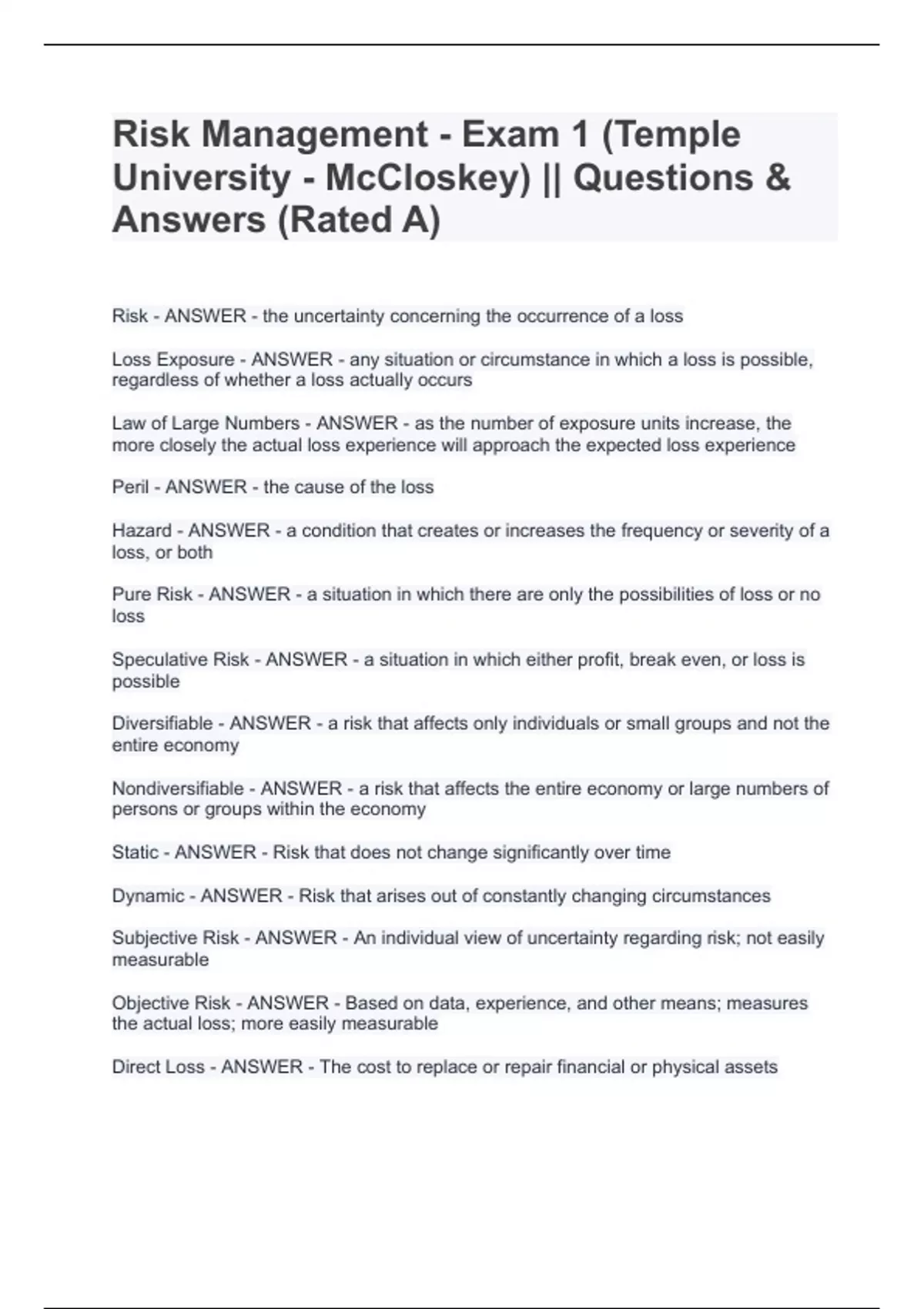 Risk Management - Exam 1 (Temple University - McCloskey) || Questions & Answers (Rated A)
