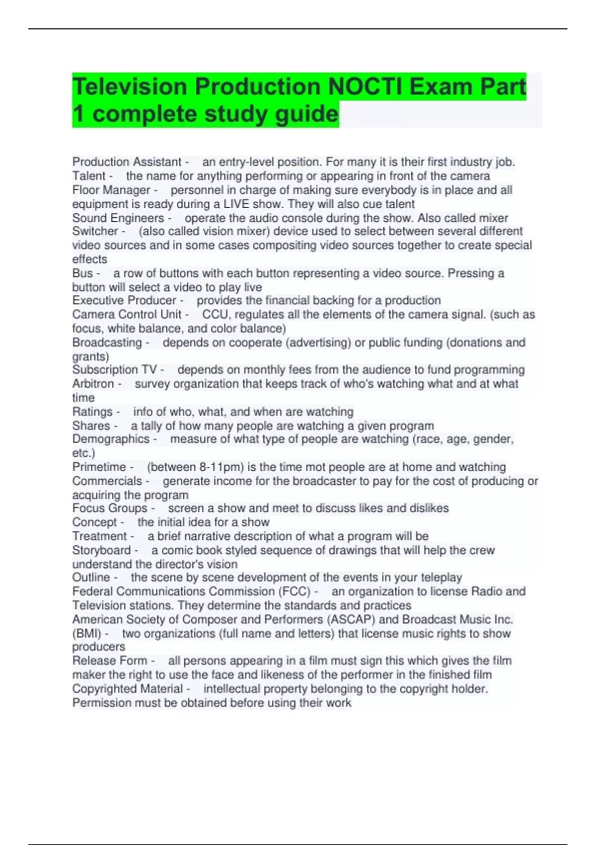 Television Production NOCTI Exam Part 1 complete study guide Television Production NOCTI Exam Part 1 complete study guide Television Production NOCTI ExaTelevision Production NOCTI Exam Part 1 complete study guide Production Assistant - an entry-level position. For many it is their first industry job. Talent - the name for anything performing or appearing in front of the camera Floor Manager - personnel in charge of making sure everybody is in place and all equipment is ready during a LIVE show. They will also cue talent Sound Engineers - operate the audio console during the show. Also called mixer Switcher - (also called vision mixer) device used to select between several different video sources and in some cases compositing video sources together to create special effects Bus - a row of buttons with each button representing a video source. Pressing a button will select a video to play live Executive Producer - provides the financial backing for a production Camera Control Unit - CCU, regulates all the elements of the camera signal. (such as focus, white balance, and color balance) Broadcasting - depends on cooperate (advertising) or public funding (donations and grants) m Part 1 complete study guide