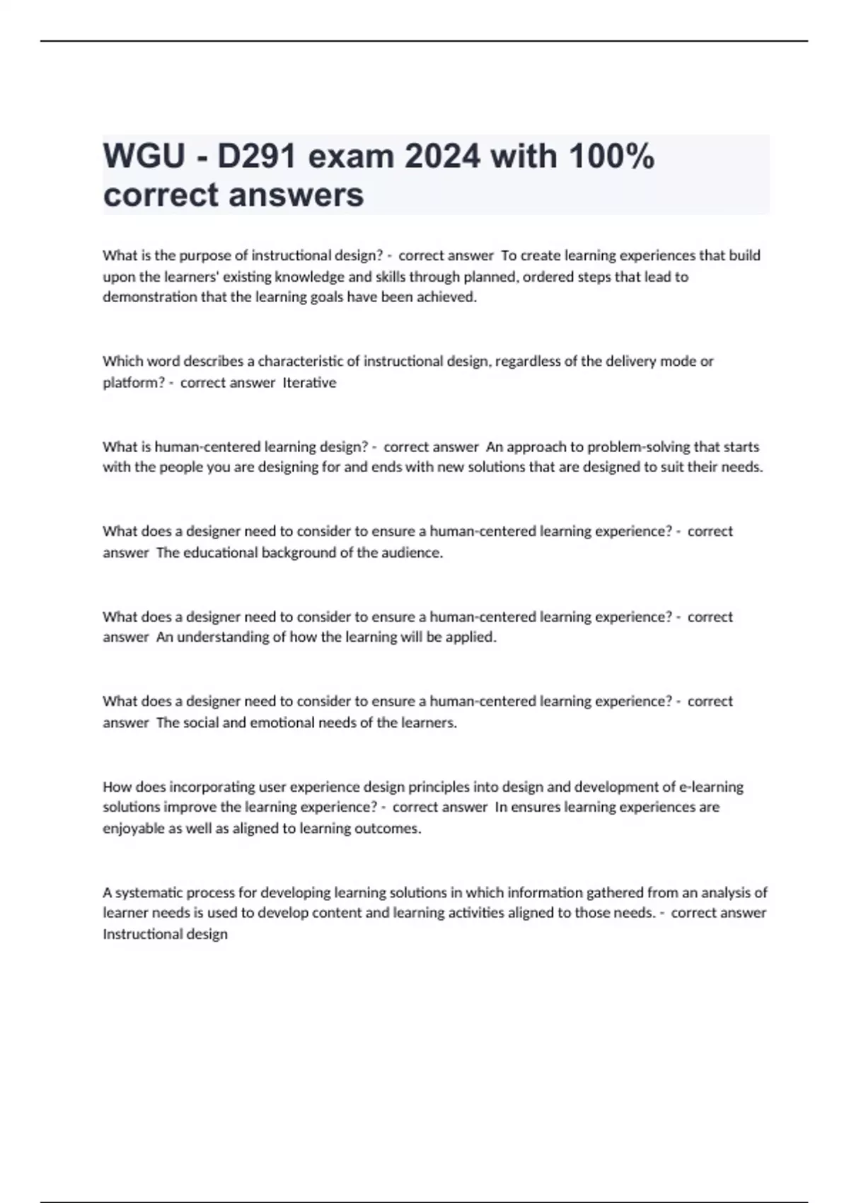 What is the purpose of instructional design? - correct answer To create learning experiences that build upon the learners' existing knowledge and skills through planned, ordered steps that lead to demonstration that the learning goals have been achieved. Which word describes a characteristic of instructional design, regardless of the delivery mode or platform? - correct answer Iterative What is human-centered learning design? - correct answer An approach to problem-solving that starts with the people you are designing for and ends with new solutions that are designed to suit their needs. What does a designer need to consider to ensure a human-centered learning experience? - correct answer The educational background of the audience. What does a designer need to consider to ensure a human-centered learning experience? - correct answer An understanding of how the learning will be applied. What does a designer need to consider to ensure a human-centered learning experience? - correct answer The social and emotional needs of the learners. How does incorporating user experience design principles into design and development of e-learning solutions improve the learning experience? - correct answer In ensures learning experiences are enjoyable as well as aligned to learning outcomes. A systematic process for developing learning solutions in which information gathered from an analysis of learner needs is used to develop content and learning activities aligned to those needs. - correct answer Instructional design A human-centered approach to learning design that incorporates an understanding of user experience design, research, a