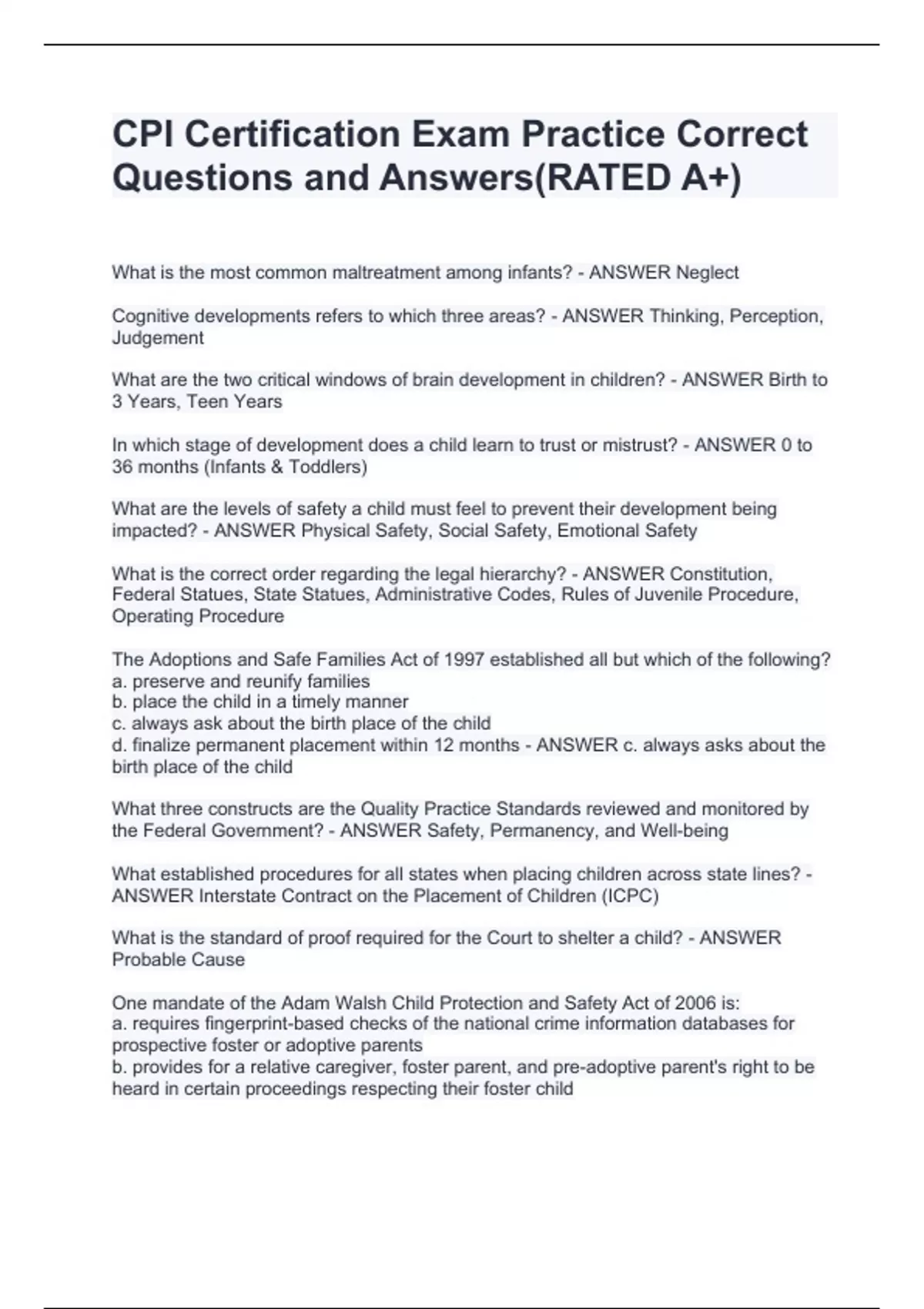 What is the most common maltreatment among infants? - ANSWER Neglect Cognitive developments refers to which three areas? - ANSWER Thinking, Perception, Judgement What are the two critical windows of brain development in children? - ANSWER Birth to 3 Years, Teen Years In which stage of development does a child learn to trust or mistrust? - ANSWER 0 to 36 months (Infants & Toddlers) What are the levels of safety a child must feel to prevent their development being impacted? - ANSWER Physical Safety, Social Safety, Emotional Safety What is the correct order regarding the legal hierarchy? - ANSWER Constitution, Federal Statues, State Statues, Administrative Codes, Rules of Juvenile Procedure, Operating Procedure The Adoptions and Safe Families Act of 1997 established all but which of the following? a. preserve and reunify families b. place the child in a timely manner c. always ask about the birth place of the child d. finalize permanent placement within 12 months - ANSWER c. always asks about the birth place of the child What three constructs are the Quality Practice Standards reviewed and monitored by the Federal Government? - ANSWER Safety, Permanency, and Well-being What established procedures for all states when placing children across state lines? - ANSWER Interstate Contract on the Placement of Children (ICPC) What is the standard of proof required for the Court to shelter a child? - ANSWER Probable Cause One mandate of the Adam Walsh Child Protection and Safety Act of 2006 is: a. requires fingerprint-based checks of the national crime information databases for prospective foster or adoptive parents b. provides for a relative caregiver, foster parent, and pre-adoptive parent's right to be heard in certain proceedings respecting their foster child c. requires a child's health and education records to be supplied to the foster parent d. allows Child Welfare Workers to remove a child without court intervention - ANSWER a. requires fingerprint-based checks of the national crime information databases for prospective foster or adoptive parents When a Child Welfare Worker removes a child from the custody of their parent/caregiver, a hearing must be held within what timeframe? - ANSWER 24 hours All but one of the following are child welfare core principles: a. the prevention and intervention by the child protective system should engage families in constructive, supportive, and non-adversarial relationships b. the prevention and intervention should intrude as little as possible into the life of the family and be focused on clearly defined objectives c. the prevention and intervention should be based on outcome evaluation results that demonstrate success in protecting children and supporting families d. the health and safety of the children served shall be of paramount concern e. the prevention and intervention within families should happen with all families - ANSWER e. the prevention and intervention within families should happen with all families As a child welfare worker you receive a new case. Upon commencement, you knock on the door and a man opens the door and identifies himself as the father you are looking for. You proceed with your investigation by interviewing the children and the speaking with the father. Towards the end of the interview with the father, the mother of the children arrives home and you realize it is your former high school best friend, and you had not recognized the name due to her now being married. After speaking with your supervisor, it is determined you will not continue forward as the assigned investigator due to which Code of Ethics violation? - ANSWER Conflict of Interest A child protective investigator responded to an abuse intake on a mother who had just given birth. Two of the parents' other children had previously been removed. After interviewing the parents, the CPI and a co-worker went to visit the children who were in relative care with an aunt and uncle. The children's uncle said that the CPI conducted a search of personal items and clothing in the dresser drawers. The uncle said he saw the CPI put drug paraphernalia and three knives into a garbage bag and remove them from the home. The CPI interviewed in this case and his co-worker believed they had the power to search through homes the same way that law enforcement would. Which ethical principle was violated? - ANSWER Misrepresentation/Misuse of Position If the hotline determines there is reason to suspect impending danger, the CPI must see and interview the alleged child victim in which response time? - ANSWER 24 hours The assessment used by a Child Protective Investigator to determine child safety is called? - ANSWER Family Functioning Assessment - Investigation If the hotline determines there is reason to suspect present danger, the CPI must see and interview the alleged child victim in which response time? - ANSWER As soon as possible True or False: The determination that a child is unsafe means that the child and family must be served through formal, ongoing case management services. - ANSWER True A case manager uses the information gathered during an FFA-Ongoing to assist in the development of a? - ANSWER Case Plan What are the three core conditions of engagement? - ANSWER Respect, Empathy, Genuineness All but one of the following are skills used to team with a family: a. Facilitate involvement of the family members in developing adequate interim safety interventions and consensus when possible b. Engage immediate and extended family in assessment of family dynamics, participation in meetings and hearings c. Be aware of one's own prejudices and biases d. Ensure a safety plan is created without any involvement from the family - ANSWER d. Ensure a safety plan is created without any involvement from the family When there are no present or impending dangers identified but the risk was scored at high or very high probability of future verified maltreatment, the Child Protective Investigator should? -