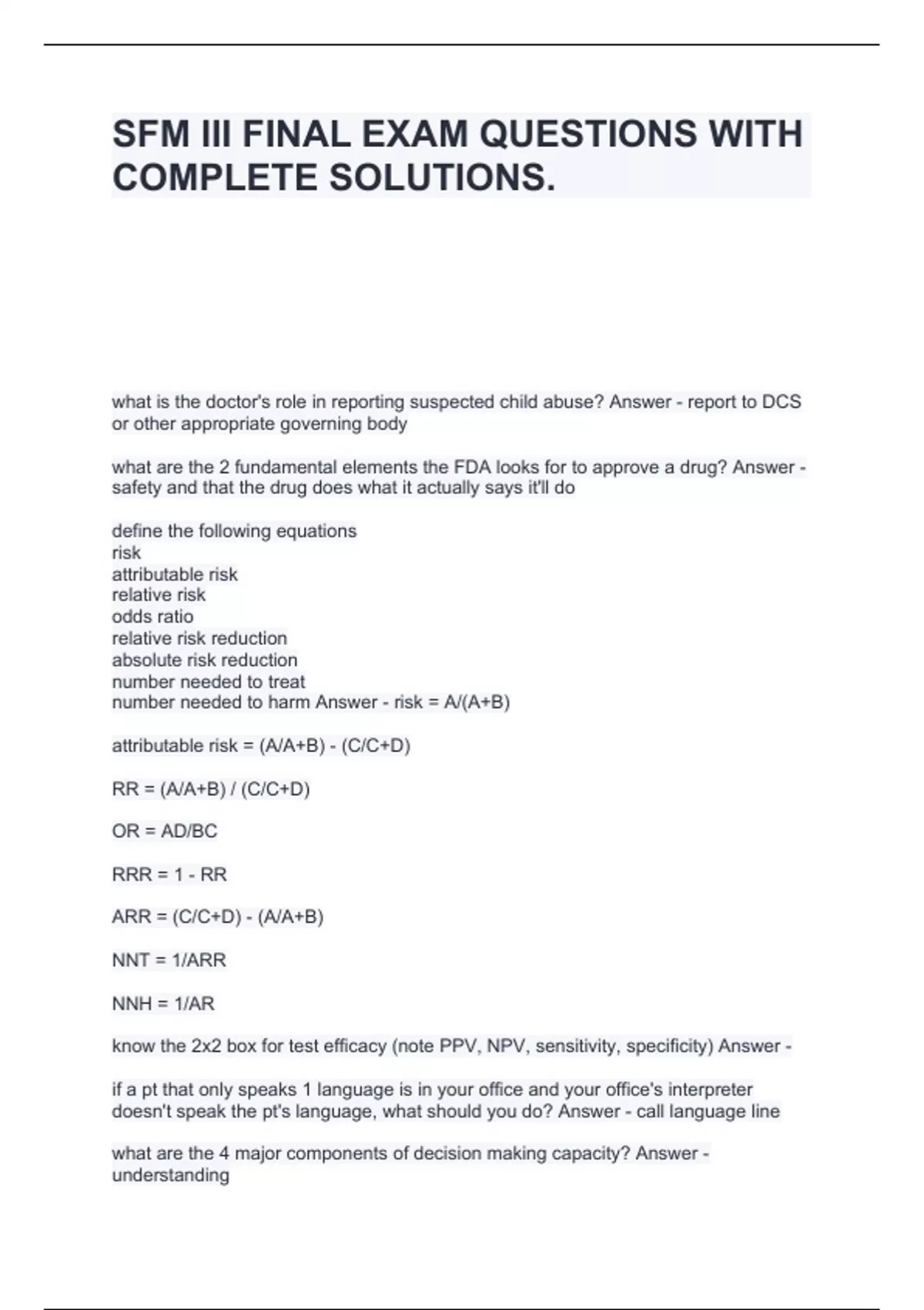 SFM III FINAL EXAM QUESTIONS WITH COMPLETE SOLUTIONS. what is the doctor's role in reporting suspected child abuse? report to DCS or other appropriate governing body what are the 2 fundamental elements the FDA looks for to approve a drug? safety and that the drug does what it actually says it'll do define the following equations risk attributable risk relative risk odds ratio relative risk reduction absolute risk reduction number needed to treat number needed to harm risk = A/(A+B) attributable risk = (A/A+B) - (C/C+D) RR = (A/A+B) / (C/C+D) OR = AD/BC RRR = 1 - RR ARR = (C/C+D) - (A/A+B) NNT = 1/ARR NNH = 1/AR know the 2x2 box for test efficacy (note PPV, NPV, sensitivity, specificity)