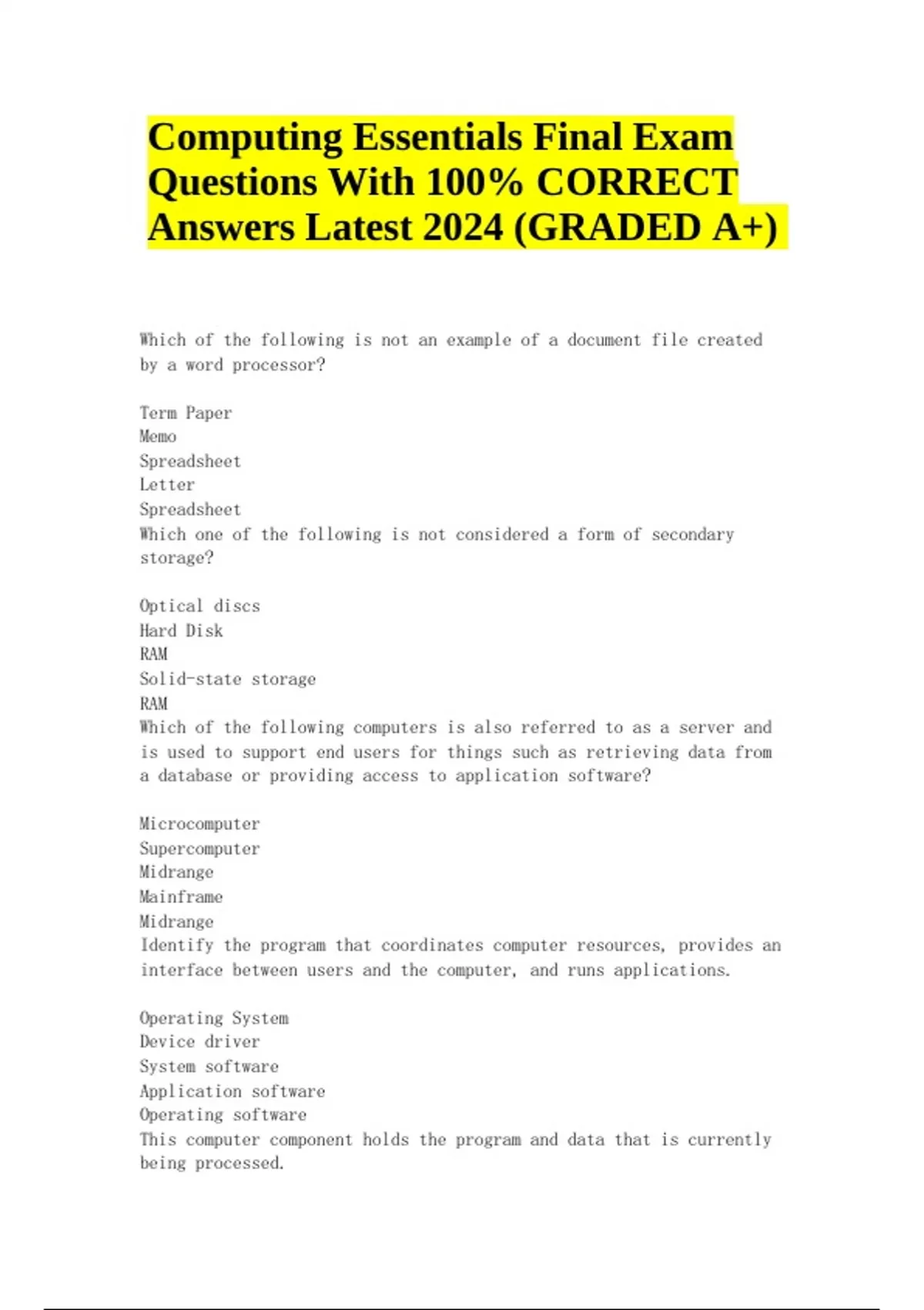 Computing Essentials Final Exam Questions With 100% CORRECT Answers Latest 2024 (GRADED A+) Which of the following is not an example of a document file created by a word processor? Term Paper Memo Spreadsheet Letter Spreadsheet Which one of the following is not considered a form of secondary storage? Optical discs Hard Disk RAM Solid-state storage RAM Which of the following computers is also referred to as a server and is used to support end users for things such as retrieving data from a database or providing access to application software? Microcomputer Supercomputer Midrange Mainframe Midrange Identify the program that coordinates computer resources, provides an interface between users and the computer, and runs applications. Operating System Device driver System software Application software Operating software This computer component holds the program and data that is currently being processed. Computing Essentials Final Exam Questions With 100% CORRECT Answers Latest 2024 (GRADED A+) ROM RAM Ports Bus RAM Employee records, including names, social security numbers, and related information, would typically be stored in what type of data file? Presentation Document Worksheet Database Database Which of the following is a collection of programs rather than a single program? Hardware Microsoft Access System software Procedures System software A financial budget would be created in what type of data file? Database Document Worksheet Presentation Worksheet A microcomputer that is smaller, lighter, and less powerful than a notebook, and that has a touch sensitive screen, is called a _______. Subnotebook Desktop Tablet Laptop Tablet The type of media that uses laser technology to store data and programs is _______. Optical disc Solid state Flash Hard disk Optical Disk In most cases, the word "software" is interchangeable with the word _______. Computer Program Application Procedure Program ______ are the most important part of any information system. Software applications Hardware applications Programs People People This hardware houses most of the electronic components that make up a computer system. Input/output devices System unit Communication Secondary storage System unit The most widely used handheld computers are _______. smartphones laptops tablets notebooks and laptops Smartphones Identify the four basic categories of hardware in a personal computer system. System unit, input/output, secondary storage, and primary storage System unit, modem, RAM, and microprocessor Hard disk, input/output, secondary storage, and display devices System unit, input/output, secondary storage, and communication System unit, input/output, secondary storage, and communication The most common way to access the Internet is through _______. Facebook an Internet service provider (ISP) an application service provider (ASP) an instant messaging (IM) service an Internet service provider (ISP) In the URL "", ".com" is the _______. uniform resource locator (URL) top-level domain (TLD) domain name domain name server (DNS) top-level domain (TLD) The Web was introduced in _____. 1967 1991 2004 1998 1991 _______ typically broadcast live events and use streaming technology in which audio and video files are continuously downloaded to your computer while you are listening to and/or viewing the content. Twitter Webcasts Blogs Microblogs Webcasts Programs that automatically start and operate as a part of your browser are called _______. pop-ups plug-ins readers ActiveX controls Plug-ins EMAIL ME: EMAIL ME: This type of e-commerce often resembles the electronic version of the classified ads or an auction. C2C B2C C2B B2B C2C In the URL "", what is the domain name? simnetonline com This type of e-mail account is more widely used because it frees the user from installing and maintaining an e-mail client on every computer used to access e-mail. Client-based Web-based Cloud Mobile Web-based When you enter a keyword or phrase into a search engine the results display as a list of these. Subjects Matches Hits Entries Hits Launched in 1969 as a U.S. funded project that developed a national computer network, the Internet was initially called _______. NSFNet ARPANET World Wide Web Intranet APRANET EMAIL ME: EMAIL ME: This method of file transfer has been used for decades and is frequently used for uploading changes to a website hosted by an Internet service provider. BitTorrent D SSP FTP FTP This social networking site is used for professional, businessoriented networking. LinkedIn Twitter Google+ Facebook Linkedln _______ do not use streaming technology and are used to download media files to your computer. Podcasts Webcasts Microblogs Twitter Podcasts A web page typically contains _______, which contains the formatting instructions for displaying the web page. uniform resource locators (URLs) top-level domain (TLD) Hypertext Markup Language (HTML) hyperlinks Hypertext Markup Language (HTML) Online banking is an example of what type of e-commerce? C2C C2B B2C B2B B2C EMAIL ME: EMAIL ME: System software can be described as end-user software and is used to accomplish a variety of tasks. True False False General-purpose applications include all of the following except: spreadsheets word processors database management systems web authoring web authoring Specialized and powerful programs, called ________ are typically used to create specialized commercial sites. graphical site map web authoring programs microblog hyperlink web authoring programs Image editors edit images consisting of thousands of pixels that form this type of image. electronic bitmap vector object bitmap Programs that combine a variety of visual objects to create attractive, visually interesting presentations are called: presentation graphics diagrams graphs charts presentation graphics which of the following programs would be used to create a website? desktop publishing web authoring image editor illustration web authoring web authoring programs that allow you to build