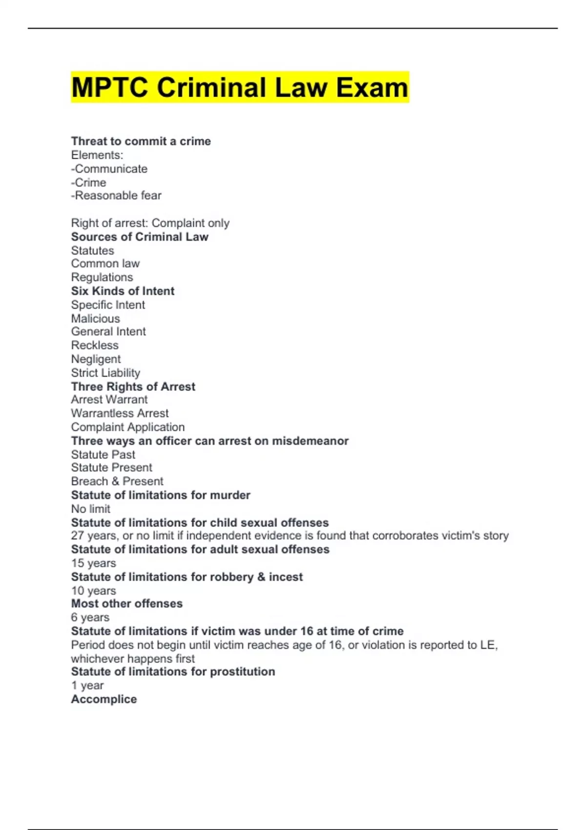 MPTC Criminal Law Exam Threat to commit a crime Elements: -Communicate -Crime -Reasonable fear Right of arrest: Complaint only Sources of Criminal Law Statutes Common law Regulations Six Kinds of Intent Specific Intent Malicious General Intent Reckless Negligent Strict Liability Three Rights of Arrest Arrest Warrant Warrantless Arrest Complaint Application Three ways an officer can arrest on misdemeanor Statute Past Statute Present Breach & Present Statute of limitations for murder No limit Statute of limitations for child sexual offenses 27 years, or no limit if independent evidence is found that corroborates victim's story Statute of limitations for adult sexual offenses 15 years Statute of limitations for robbery & incest 10 years Most other offenses 6 years Statute of limitations if victim was under 16 at time of crime Period does not begin until victim reaches age of 16, or violation is reported to LE, whichever happens first Statute of limitations for prostitution 1 year Accomplice Elements: -Intentional Participation -Criminal Mindset Right of arrest: depends on crime Penalty: -Exactly the same as principal Accessory after the fact Elements: -Knowledge of felony -Assist -Felon -Intent to avoid arrest Right of Arrest: Felony Attempt to commit a crime Elements: -Specific Intent -Overt Act -Failure Right of Arrest: -felony if attempt is felony punishable by at least 5 years -complaint if attempt is felony punishable by less than 5 years or any misdemeanor -warrantless arrest in presence if attempt involves any larceny Conspiracy Element: -agreement between two or more people to do something unlawful Right of Arrest: -if conspiring to commit felony: felony -if conspiring to commit misdemeanor: complaint Solicitation of a felony Elements: -solicit -intent Right of arrest: -never been decided, get a warrant Extortion Elements: -Communication -Suspect maliciously intended to accuse another of a crime, injure the person or property of another, or use power invested in suspect against another -Intent to get something Right of arrest: felony Assault Elements: -Attempted Battery, or -Threatened Battery Right of Arrest: arrest for breach in presence, complaint if not Assault by Dangerous Weapon Elements: -Assault -Dangerous weapon Right of arrest: felony Assault and Battery Elements: Intentional -Intentionally touched -Without having the right -Cause physical harm or person did not consent Reckless -Suspect engaged in reckless conduct -Caused bodily harm to another Right of arrest: -arrest for breach in present, complaint if not -certain factors make it a felony A&B by Dangerous Weapon Elements: -A&B -Dangerous weapon Right of arrest: felony Mayhem Elements: Specific Acts -Suspect maliciously intended to maim or disfigure, and committed cutting out or maimed the tongue; put or destroyed an eye; cut or tore off an ear; cut, slit or mutilated the nose or lip; or cut off or disabled a limb or member of the victim Dangerous substance or weapon -Suspect maliciously intended to maim or disfigure, and assaulted the victim with dangerous weapon or substance, and disfigured, crippled, or inflicted serious or permanent physical injury Privy -suspect was privy to someone else's intent to maim Right of arrest: felony A&B on a Public Employee Elements: -A&B -Public Employee -Duty Right of Arrest: -Arrest for breach in presence, complaint if not -Felony if attempt to disarm police officer Interfering with a Police Officer Elements: -Intimidate, hinder, or interrupt -Police officer -Duty Right of arrest: arrest for breach in presence Neglect or refusal to assist officer Elements: -Person required by police -Neglected or refused assistance Right of arrest: -Arrest for breach in presence, complaint if not Resisting Arrest Elements: -Prevent or attempt -Police officer -Arrest -Force, threat, or risk of injury. Right of arrest: -officer is already making an arrest, considered a breach Right to know grounds for arrest Elements: -An officer arrested a person and refused to tell reason for arrest, answered untruthfully, or neglected to exhibit warrant Right of arrest: complaint False arrest Elements: -pretended to have legal process or pretended to have different legal process Right of arrest: complaint False name or SSN following arrest Elements: -Knowingly -False name or SSN -Police -Post-arrest Right of arrest: not applicable Note: must prove use of false name Escape from police lockup Elements: -suspect was lawfully placed into custody of a jail and escaped Right of arrest: arrest for breach in presence, complaint if not Aiding prisoner in police custody Elements: -Suspect aided or assisted in escaping or attempting to escape from lawful custody Right of arrest: arrest for breach in presence, complaint if not Second Degree Murder Elements: -Suspect committed an unlawful killing -With malice Right of arrest: felony First Degree Murder Elements: -Suspect committed an unlawful killing -With malice -Aggravating factor of deliberate premeditation, extreme atrocity or cruelty, or commission or attempted commission of a crime punishable by life Right of arrest: felony First degree felony murder Elements: -Same as first degree murder without intent or malice....usually during the commission of inherently dangerous crime Right of arrest: felony Second Degree felony murder Elements: -Homicide doing the commission of a felony that is not punishable by life