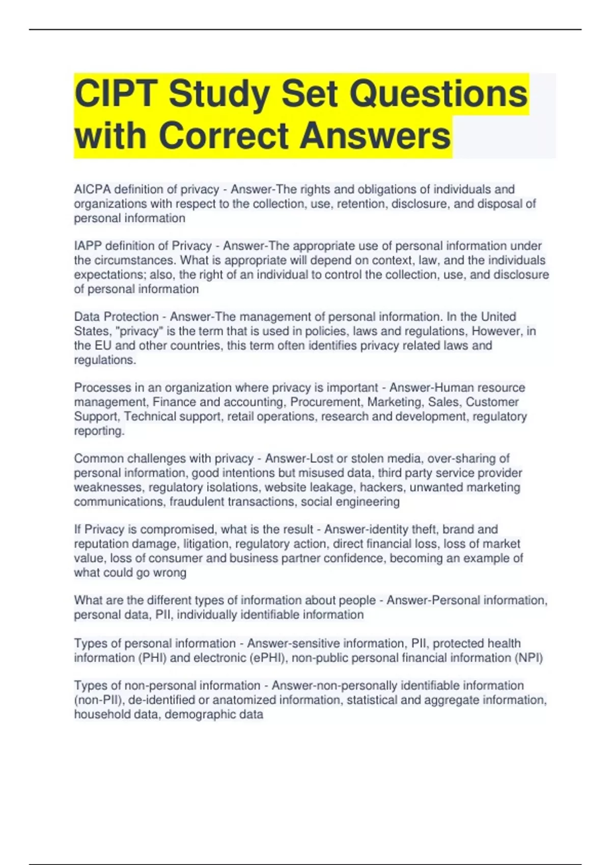CIPT Study Set Questions with Correct Answers (1) AICPA definition of privacy - Answer-The rights and obligations of individuals and organizations with respect to the collection, use, retention, disclosure, and disposal of personal information IAPP definition of Privacy - Answer-The appropriate use of personal information under the circumstances. What is appropriate will depend on context, law, and the individuals expectations; also, the right of an individual to control the collection, use, and disclosure of personal information Data Protection - Answer-The management of personal information. In the United States, "privacy" is the term that is used in policies, laws and regulations, However, in the EU and other countries, this term often identifies privacy related laws and regulations. Processes in an organization where privacy is important - Answer-Human resource management, Finance and accounting, Procurement, Marketing, Sales, Customer Support, Technical support, retail operations, research and development, regulatory reporting. Common challenges with privacy - Answer-Lost or stolen media, over-sharing of personal information, good intentions but misused data, third party service provider weaknesses, regulatory isolations, website leakage, hackers, unwanted marketing communications, fraudulent transactions, social engineering