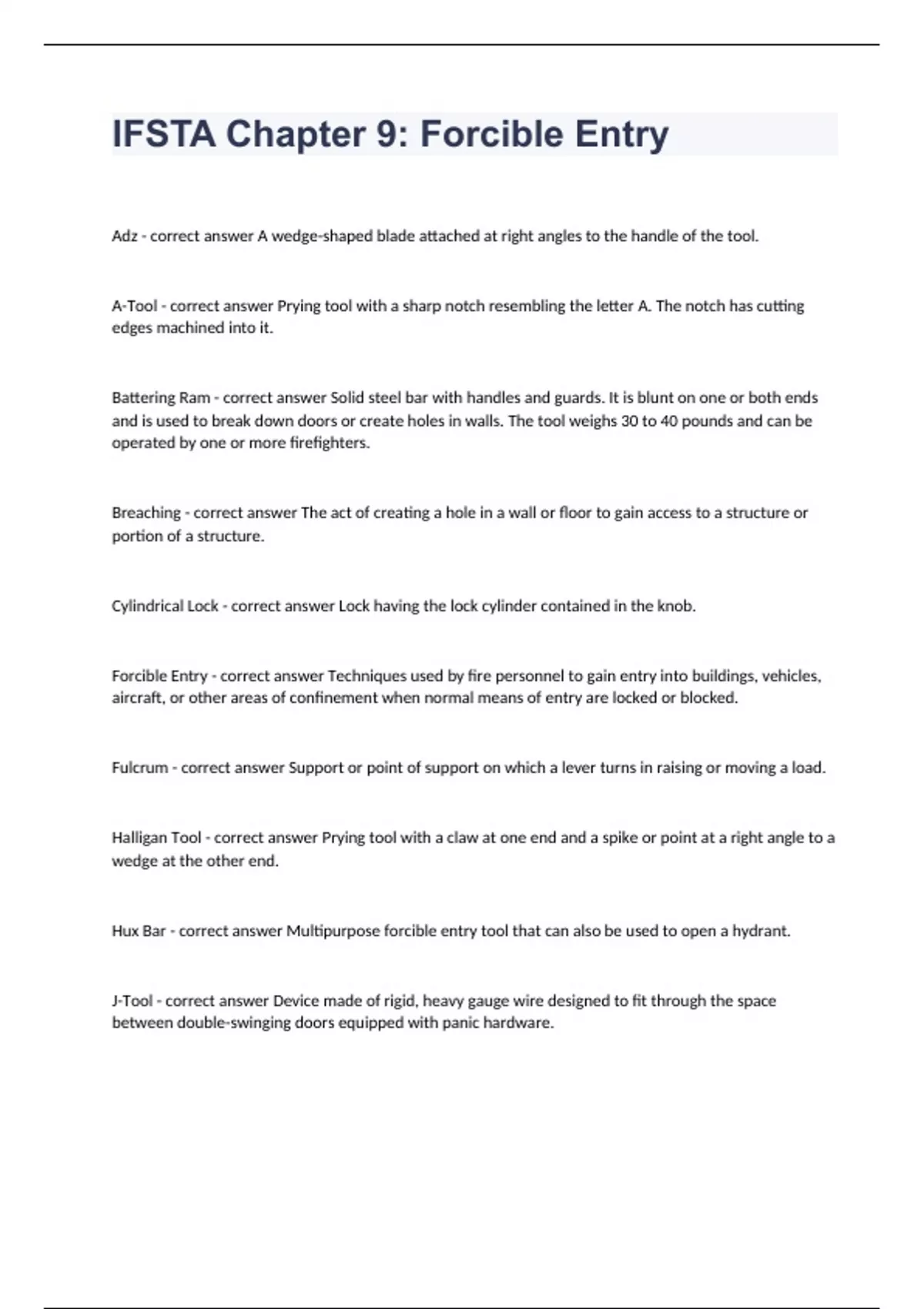 IFSTA Chapter 9: Forcible Entry Adz - correct answer A wedge-shaped blade attached at right angles to the handle of the tool. A-Tool - correct answer Prying tool with a sharp notch resembling the letter A. The notch has cutting edges machined into it. Battering Ram - correct answer Solid steel bar with handles and guards. It is blunt on one or both ends and is used to break down doors or create holes in walls. The tool weighs 30 to 40 pounds and can be operated by one or more firefighters. Breaching - correct answer The act of creating a hole in a wall or floor to gain access to a structure or portion of a structure. Cylindrical Lock - correct answer Lock having the lock cylinder contained in the knob. Forcible Entry - correct answer Techniques used by fire personnel to gain entry into buildings, vehicles, aircraft, or other areas of confinement when normal means of entry are locked or blocked. Fulcrum - correct answer Support or point of support on which a lever turns in raising or moving a load. Halligan Tool - correct answer Prying tool with a claw at one end and a spike or point at a right angle to a wedge at the other end. Hux Bar - correct answer Multipurpose forcible entry tool that can also be used to open a hydrant. J-Tool - correct answer Device made of rigid, heavy gauge wire designed to fit through the space between double-swinging doors equipped with panic hardware.
