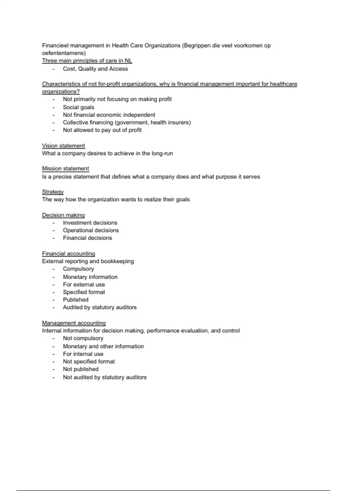 Financieel management in Health Care Organizations (Begrippen die veel voorkomen op