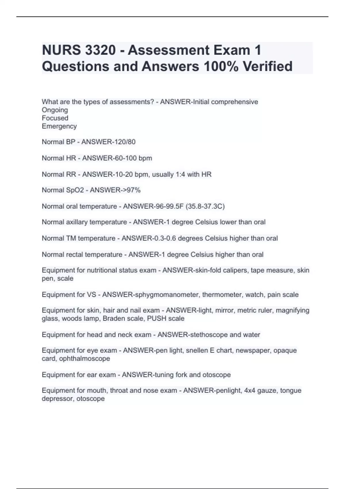 NURS 3320 - Assessment Exam 1 Questions and Answers 100% VerifiedNURS 3320 - Assessment Exam 1 Questions and Answers 100% VerifiedNURS 3320 - Assessment Exam 1 Questions and Answers 100% Verified What are the types of assessments? - ANSWER-Initial comprehensive Ongoing Focused Emergency Normal BP - ANSWER-120/80 Normal HR - ANSWER-60-100 bpm Normal RR - ANSWER-10-20 bpm, usually 1:4 with HR