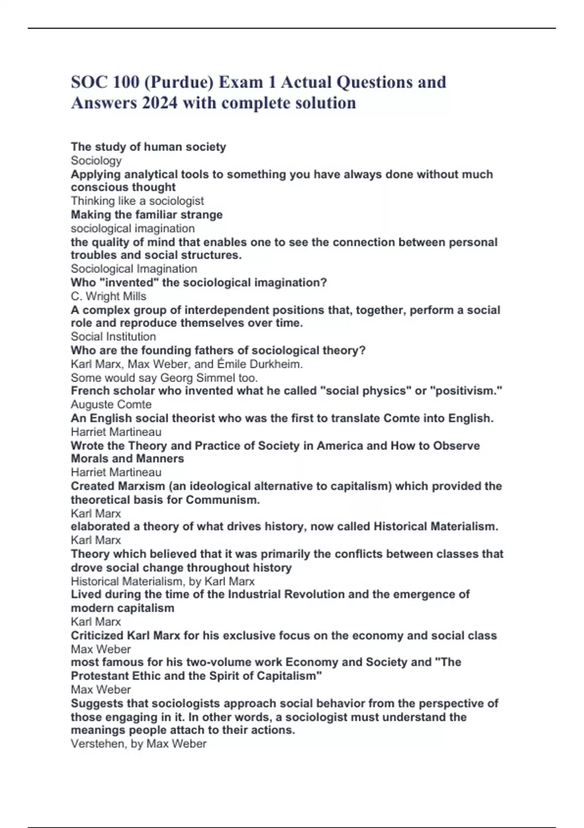 SOC 100 (Purdue) Exam 1 Actual Questions and Answers 2024 with complete solution The study of human society Sociology Applying analytical tools to something you have always done without much conscious thought Thinking like a sociologist Making the familiar strange sociological imagination the quality of mind that enables one to see the connection between personal troubles and social structures. Sociological Imagination Who "invented" the sociological imagination? C. Wright Mills A complex group of interdependent positions that, together, perform a social role and reproduce themselves over time. Social Institution Who are the founding fathers of sociological theory? Karl Marx, Max Weber, and Émile Durkheim. Some would say Georg Simmel too. French scholar who invented what he called "social physics" or "positivism." Auguste Comte An English social theorist who was the first to translate Comte into English. Harriet Martineau Wrote the Theory and Practice of Society in America and How to Observe Morals and Manners Harriet Martineau Created Marxism (an ideological alternative to capitalism) which provided the theoretical basis for Communism. Karl Marx elaborated a theory of what drives history, now called Historical Materialism. Karl Marx Theory which believed that it was primarily the conflicts between classes that drove social change throughout history Historical Materialism, by Karl Marx Lived during the time of the Industrial Revolution and the emergence of modern capitalism Karl Marx Criticized Karl Marx for his exclusive focus on the economy and social class Max Weber most famous for his two-volume work Economy and Society and "The Protestant Ethic and the Spirit of Capitalism" Max Weber Suggests that sociologists approach social behavior from the perspective of those engaging in it. In other words, a sociologist must understand the meanings people attach to their actions. Verstehen, by Max Weber