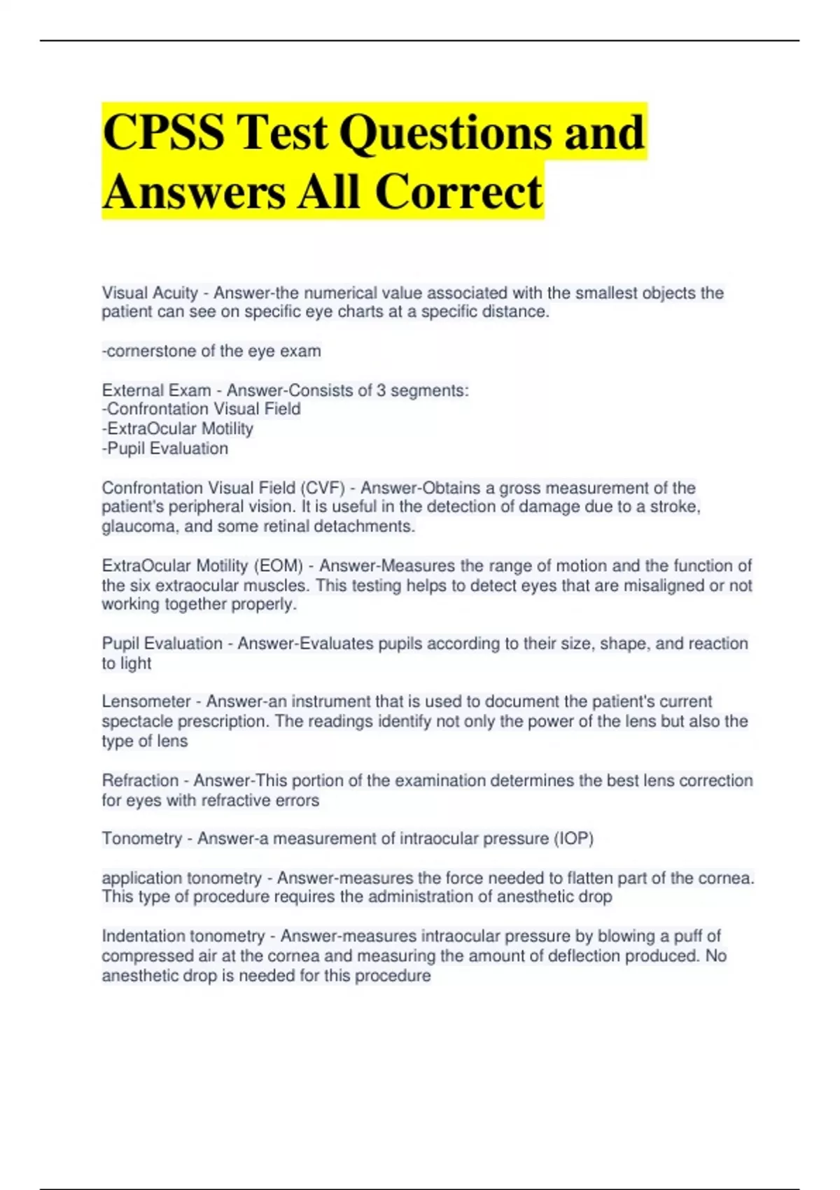 CPSS Test Questions and Answers All Correct Visual Acuity - Answer-the numerical value associated with the smallest objects the patient can see on specific eye charts at a specific distance. -cornerstone of the eye exam External Exam - Answer-Consists of 3 segments: -Confrontation Visual Field -ExtraOcular Motility -Pupil Evaluation Confrontation Visual Field (CVF) - Answer-Obtains a gross measurement of the patient's peripheral vision. It is useful in the detection of damage due to a stroke, glaucoma, and some retinal detachments. ExtraOcular Motility (EOM) - Answer-Measures the range of motion and the function of the six extraocular muscles. This testing helps to detect eyes that are misaligned or not working together properly. Pupil Evaluation - Answer-Evaluates pupils according to their size, shape, and reaction to light Lensometer - Answer-an instrument that is used to document the patient's current spectacle prescription. The readings identify not only the power of the lens but also the type of lens Refraction - Answer-This portion of the examination determines the best lens correction for eyes with refractive errors Tonometry - Answer-a measurement of intraocular pressure (IOP)