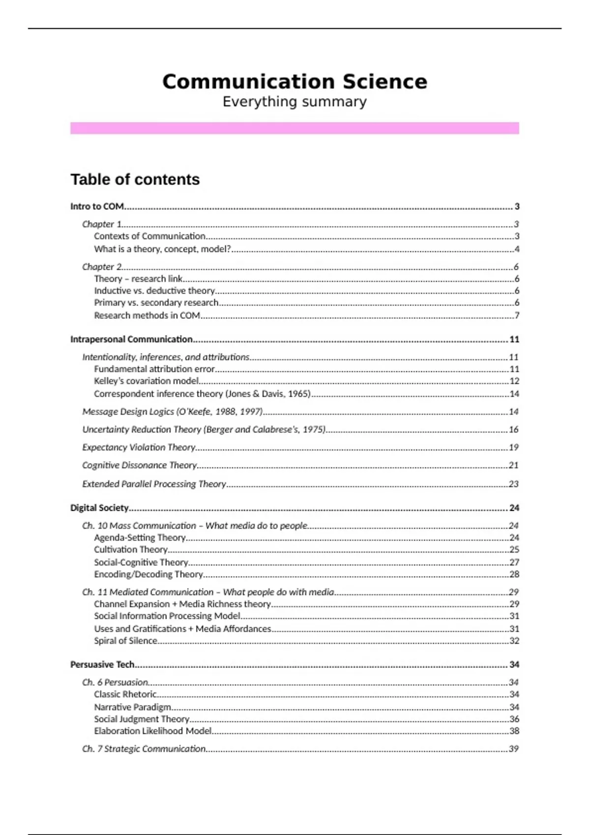 In this summary you'll find the exam material for the course Communication Science (premaster COM at UTwente). This includes some information from the lecture slides and a summary of all the theories from the book, Applying Communication Theory for Professional Life. Also added are theories from the Persuative Tech lectures. With this summary I was able to pass the course with a 7.