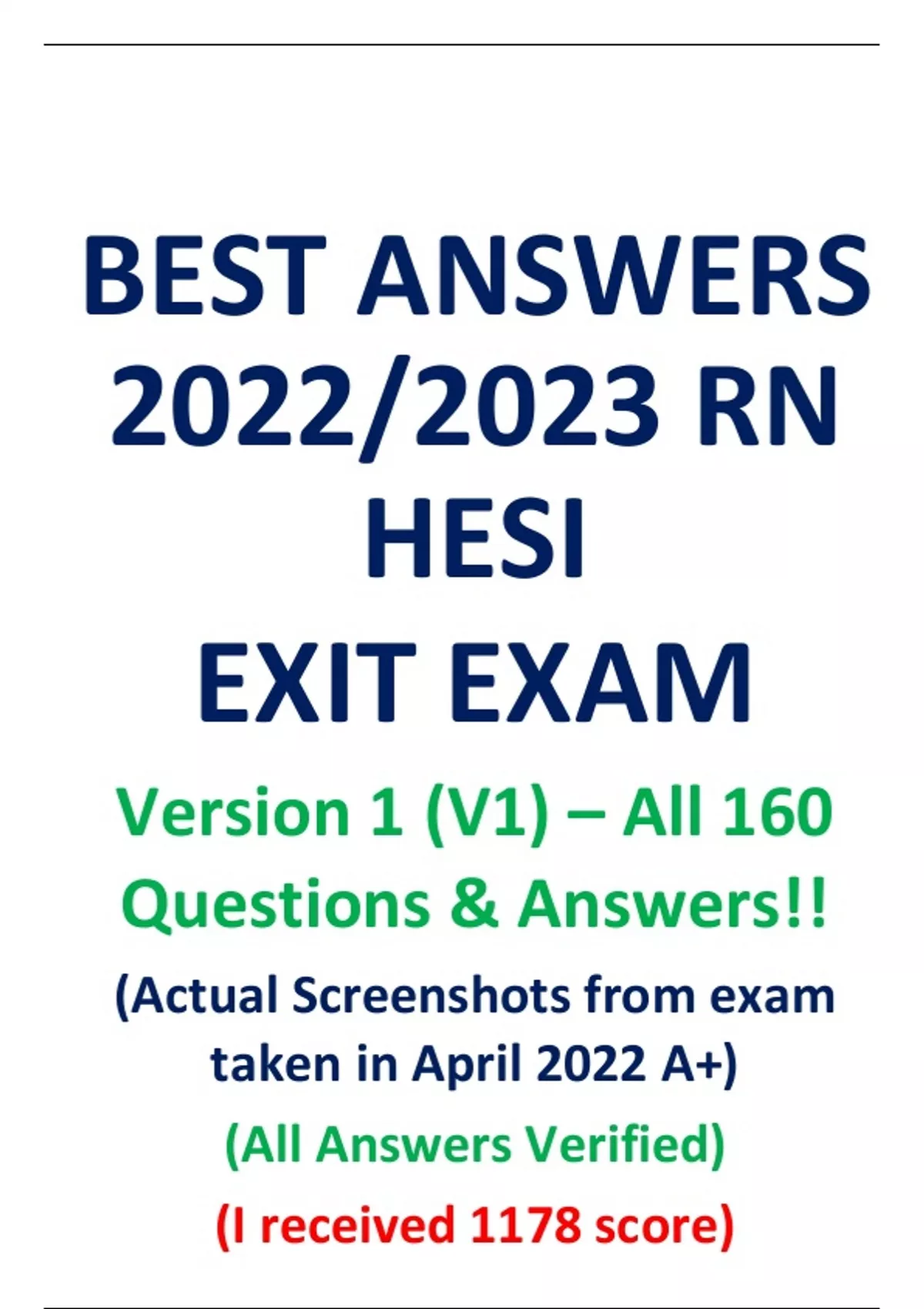 BEST ANSWERS 2022/2023 RN HESI EXIT EXAM Version 1 (V1) – All 160 Questions & Answers!! (Actual Screenshots from exam taken in April 2022 A+) (All Answers Verified) (I received 1178 score)