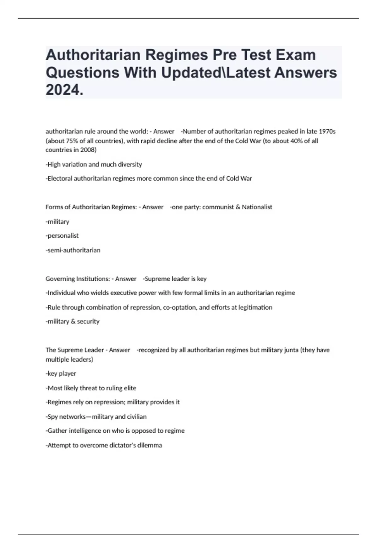 Authoritarian Regimes Pre Test Exam Questions With UpdatedLatest Answers 2024.