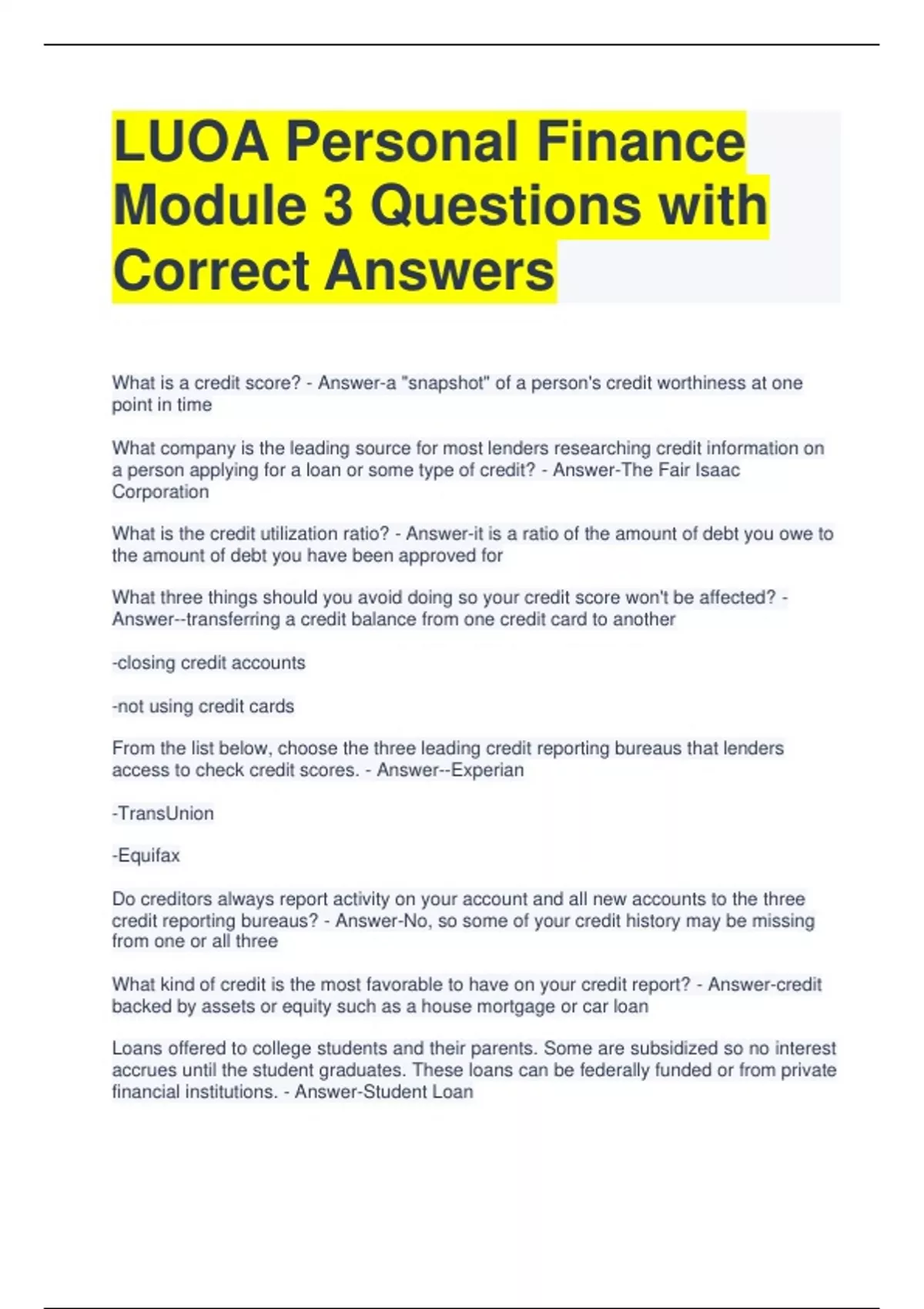 LUOA Personal Finance Module 3 Questions with Correct Answers What is a credit score? - Answer-a "snapshot" of a person's credit worthiness at one point in time What company is the leading source for most lenders researching credit information on a person applying for a loan or some type of credit? - Answer-The Fair Isaac Corporation What is the credit utilization ratio? - Answer-it is a ratio of the amount of debt you owe to the amount of debt you have been approved for What three things should you avoid doing so your credit score won't be affected? - Answer--transferring a credit balance from one credit card to another -closing credit accounts -not using credit cards From the list below, choose the three leading credit reporting bureaus that lenders access to check credit scores. - Answer--Experian -TransUnion -Equifax Do creditors always report activity on your account and all new accounts to the three credit reporting bureaus? - Answer-No, so some of your credit history may be missing from one or all three What kind of credit is the most favorable to have on your credit report? - Answer-credit backed by assets or equity such as a house mortgage or car loan