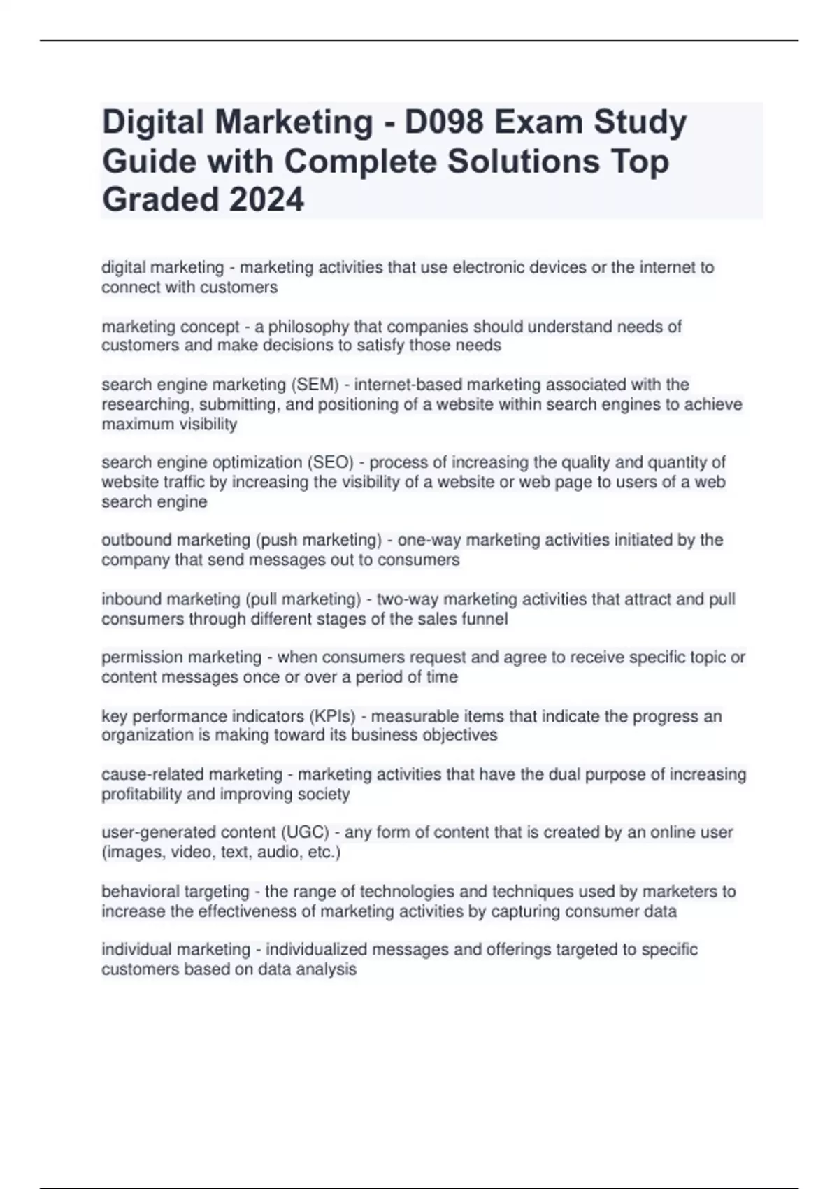 Digital Marketing - D098 Exam Study Guide with Complete Solutions Top Graded 2024