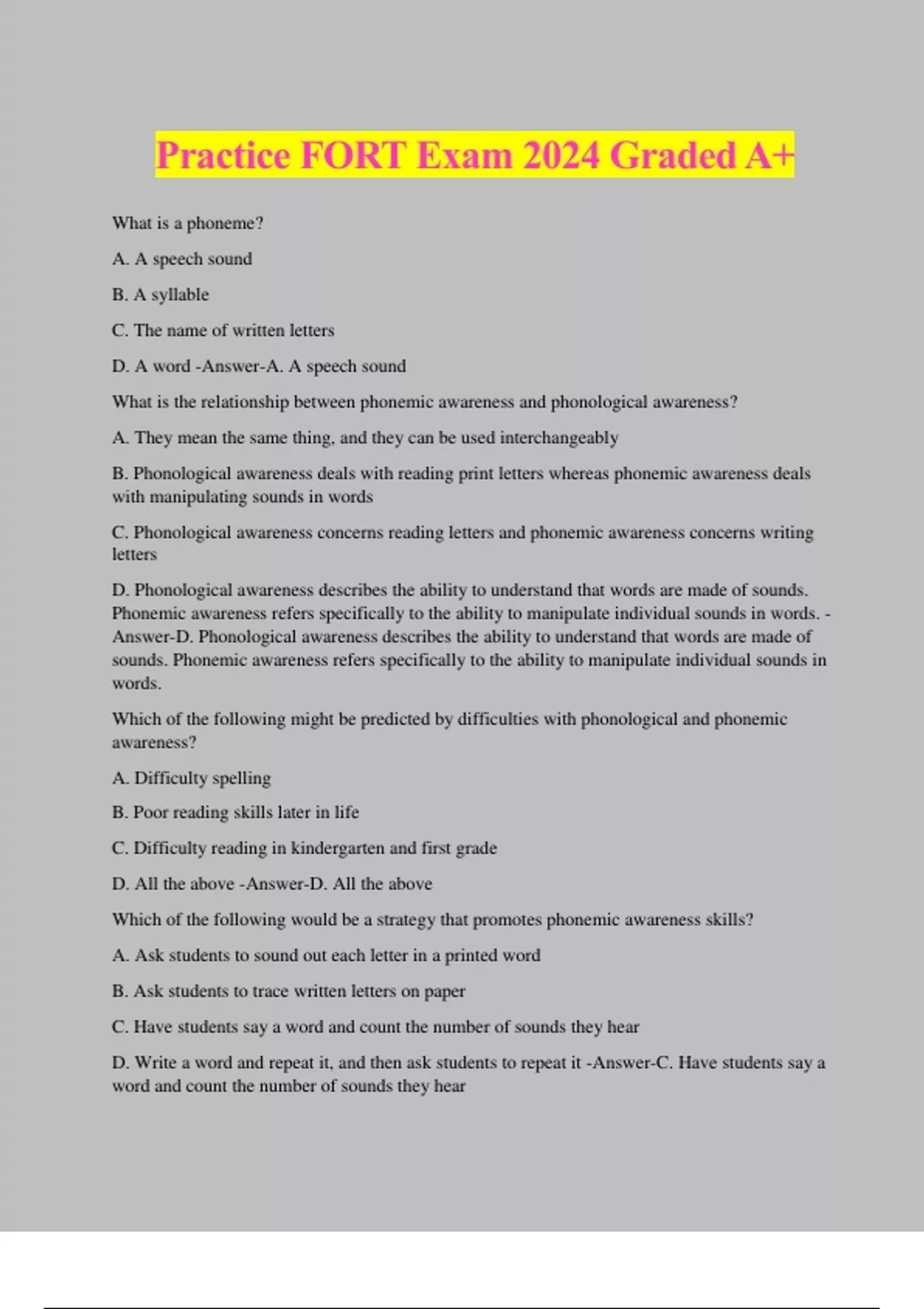 Practice FORT Exam 2024 Graded A+ What is a phoneme? A. A speech sound B. A syllable C. The name of written letters D. A word -Answer-A. A speech sound What is the relationship between phonemic awareness and phonological awareness? A. They mean the same thing, and they can be used interchangeably B. Phonological awareness deals with reading print letters whereas phonemic awareness deals with manipulating sounds in words C. Phonological awareness concerns reading letters and phonemic awareness concerns writing letters D. Phonological awareness describes the ability to understand that words are made of sounds. Phonemic awareness refers specifically to the ability to manipulate individual sounds in words. - Answer-D. Phonological awareness describes the ability to understand that words are made of sounds. Phonemic awareness refers specifically to the ability to manipulate individual sounds in words. Which of the following might be predicted by difficulties with phonological and phonemic awareness? A. Difficulty spelling B. Poor reading skills later in life C. Difficulty reading in kindergarten and first grade D. All the above -Answer-D. All the above Which of the following would be a strategy that promotes phonemic awareness skills? A. Ask students to sound out each letter in a printed word B. Ask students to trace written letters on paper C. Have students say a word and count the number of sounds they hear D. Write a word and repeat it, and then ask students to repeat it -Answer-C. Have students say a word and count the number of sounds they hear How many phonemes are in the word bass? A. 1 B. 2 C. 3 D. 4 -Answer-C. 3 Which of the following would NOT be a strategy that primarily promotes phonological awareness? A. Point to letters on a chart, say a word that starts with the letter, and stress the first sound. Ask students to repeat initial phoneme B. Ask students to change the onset to make a rhyme C. Ask students to repeat a word and count the number of sounds D. Read a word aloud, and ask students to write it -Answer-D. Read a word aloud, and ask students to write it Which of the following skills could a child with phonological awareness do? A. Sound a one-syllable print word B. Transcribe in writing a rhyme using onset and rime C. Write the alphabet D. Hear and repeat rhymes using onset and rime -Answer-D. Hear and repeat rhymes using onset and rime Which part of the word sport is the onset, and which part is the rime? A. "Sp" is the onset, "ort" is the rime B. "S" is the onset and "port" is the rime C. "Ort is the onset and "sp" is the rime D. There is not onset in one-syllable words, and "ort" is the rime. -Answer-A. "Sp" is the onset, "ort" is the rime A student has been assessed as having moderate phonemic awareness skills. Which of the following is most likely the highest skill a student with moderate phonemic awareness could demonstrate? A. The student can make a rhyme using the rime of a word B. The student can identify that the word "bat" starts with /b/ and ends in /t/ but cannot identify all of the individual sounds C. The student can identify all of the sounds in the word "mailbox" D. The student can hear a letter and write the letter on paper -Answer-B. The student can identify that the word "bat" starts with /b/ and ends in /t/ but cannot identify all of the individual sounds An ELL student in a first-grade class has been assessed as having weak phonemic awareness skills. Which activity would be most beneficial for this student? A. Model print directionality B. Teach the student common rhymes C. Introduce phonemes that may not be in the student's first language D. Present the student with a list of common onsets -Answer-C. Introduce phonemes that may not be in the student's first language What skill does a child who can clap the number of syllables in a word demonstrate? A. Phonological awareness by segmenting B. Phonemic awareness by blending C. Phonemic awareness by segmenting D. Phonological awareness by substituting -Answer-A. Phonological awareness by segmenting Knowledge of onset/rime can best benefit a student in reading which word? A. Plate B. Where C. Said D. Ice -Answer-A. Plate Which of the following skills is generally considered the most difficult? A. Segmenting words in a sentence B. Blending phonemes into words C. Deleting phonemes from a one-syllable word D. Substituting one phoneme for another in a one-syllable word -Answer-D. Substituting one phoneme for another in a one-syllable word How do blending skills influence reading comprehension? A. Blending is an important practice skill, but not incorporated into reading text B. Difficulty with blending can resul
