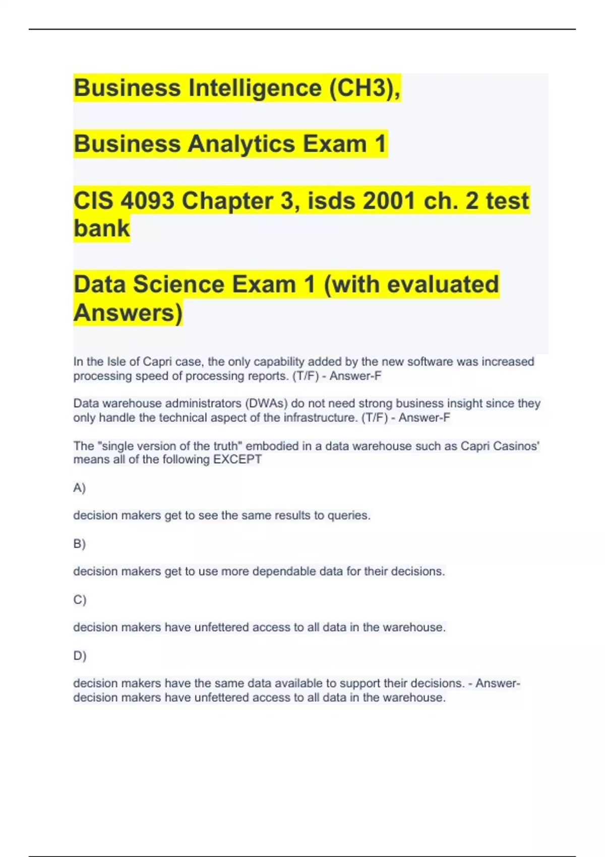 In the Isle of Capri case, the only capability added by the new software was increased processing speed of processing reports. (T/F) - Answer-F Data warehouse administrators (DWAs) do not need strong business insight since they only handle the technical aspect of the infrastructure. (T/F) - Answer-F The "single version of the truth" embodied in a data warehouse such as Capri Casinos' means all of the following EXCEPT A) decision makers get to see the same results to queries. B) decision makers get to use more dependable data for their decisions. C) decision makers have unfettered access to all data in the warehouse. D) decision makers have the same data available to support their decisions. - Answer-decision makers have unfettered access to all data in the warehouse.