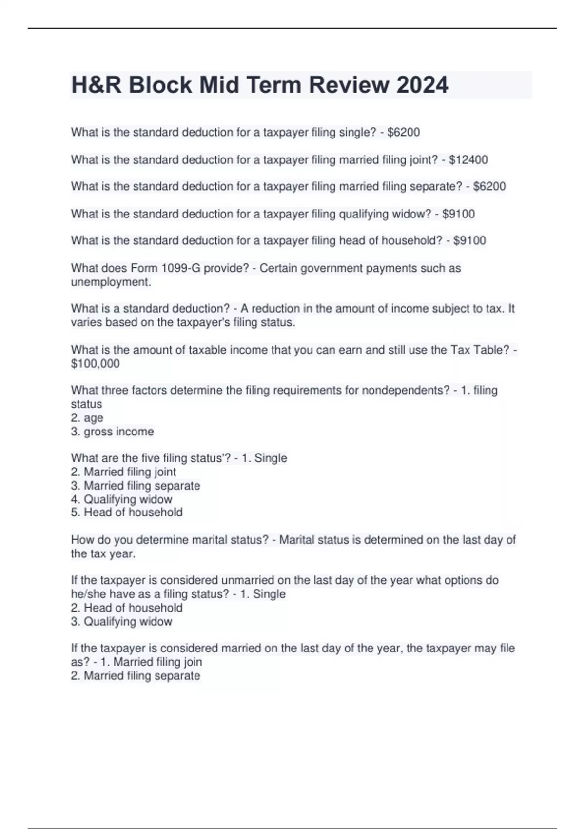 What is the standard deduction for a taxpayer filing single? - $6200 What is the standard deduction for a taxpayer filing married filing joint? - $12400 What is the standard deduction for a taxpayer filing married filing separate? - $6200 What is the standard deduction for a taxpayer filing qualifying widow? - $9100 What is the standard deduction for a taxpayer filing head of household? - $9100 What does Form 1099-G provide? - Certain government payments such as unemployment. What is a standard deduction? - A reduction in the amount of income subject to tax. It varies based on the taxpayer's filing status. What is the amount of taxable income that you can earn and still use the Tax Table? - $100,000 What three factors determine the filing requirements for nondependents? - 1. filing status 2. age 3. gross income What are the five filing status'? - 1. Single 2. Married filing joint 3. Married filing separate 4. Qualifying widow 5. Head of household How do you determine marital status? - Marital status is determined on the last day of the tax year. If the taxpayer is considered unmarried on the last day of the year what options do he/she have as a filing status? - 1. Single 2. Head of household 3. Qualifying widow If the taxpayer is considered married on the last day of the year, the taxpayer may file as? - 1. Married filing join 2. Married filing separate When is a nondependent taxpayer required to file a tax return? - Generally, the nondependent taxpayer would be required to file a tax return when their gross income is equal to or greater than the sum of the taxpayer's standard deduction and personal exemption amount. If a person is filing married filing separately, when are they required to file a tax return? - When their gross income equals or exceeds the personal exemption amount ($3950 for 2014). Taxpayers filing as single who are 65 or older and/or blind are entitled to what increased standard deduction. - $1550 (per condition) Taxpayers filing as head of household who are 65 or older and/or blind are entitled to what increased standard deduction. - $1550 (per condition) Taxpayers filing as married who are 65 or older and/or blind are entitled to what increased standard deduction. - $1200 (per condition) Taxpayers filing as qualifying widow who are 65 or older and/or blind are entitled to what increased standard deduction. - $1200 (per condition) When may a taxpayer filing married but separate claim a spouse's personal exemption? - When the spouse: 1. has no gross income 2. is not filing a return 3. is not a dependent of another person When may a taxpayer with a nonresident alien spouse claim the spouse's personal exemption? - When the spouse: 1. has no gross income 2. is not filing a return 3. is not a dependent of another person How do you determine if a dependent taxpayer is required to file? - 1. Is their unearned income greater than $1000? If so, they must file. 2. Does their earned income exceed a specific threshold amount based on their marital status, age, or blind? If so, then they must file. 3. Is their spouse filing MFS and itemizing deductions? AND Does the dependent taxpayer have at least $5 of gross income? If so, then they must file. 4. Does their gross income exceed a specific threshold amount based on their marital status, age, or blind? If so, then they must file.
