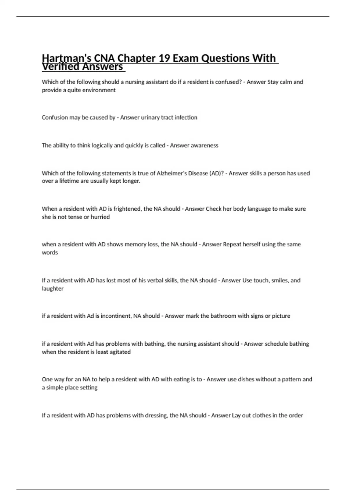 Hartman's CNA Chapter 19 Exam Questions With Verified Answers