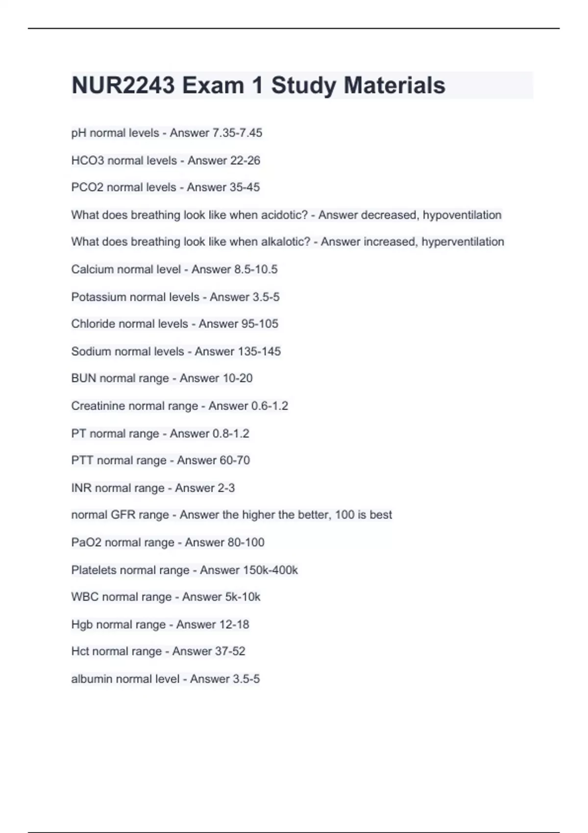 NUR2243 Respiratory Assessment Question and Answers Graded A+ 2023/2024 pH normal levels - Answer 7.35-7.45 HCO3 normal levels - Answer 22-26 PCO2 normal levels - Answer 35-45 What does breathing look like when acidotic? - Answer decreased, hypoventilation What does breathing look like when alkalotic? - Answer increased, hyperventilation Calcium normal level - Answer 8.5-10.5 Potassium normal levels - Answer 3.5-5 Chloride normal levels - Answer 95-105 Sodium normal levels - Answer 135-145 BUN normal range - Answer 10-20 Creatinine normal range - Answer 0.6-1.2 PT normal range - Answer 0.8-1.2 PTT normal range - Answer 60-70 INR normal range - Answer 2-3 normal GFR range - Answer the higher the better, 100 is best PaO2 normal range - Answer 80-100 Platelets normal range - Answer 150k-400k WBC normal range - Answer 5k-10k Hgb normal range - Answer 12-18 Hct normal range - Answer 37-52 albumin normal level - Answer 3.5-5 AST normal range - Answer 0-35 ALT normal range - Answer 4-36 PaCO2 represents which system? - Answer Respiratory HCO3 represents which system? - Answer Metabolic Describe an uncompensated ABG imbalance - Answer pH abnormal, CO2 OR HCO3 abnormal describe a partially compensated ABG imbalance - Answer all 3 (pH, CO2, HCO3) abnormal describe a fully compensated ABG imbalance - Answer pH normal, CO2 AND HCO3 abnormal