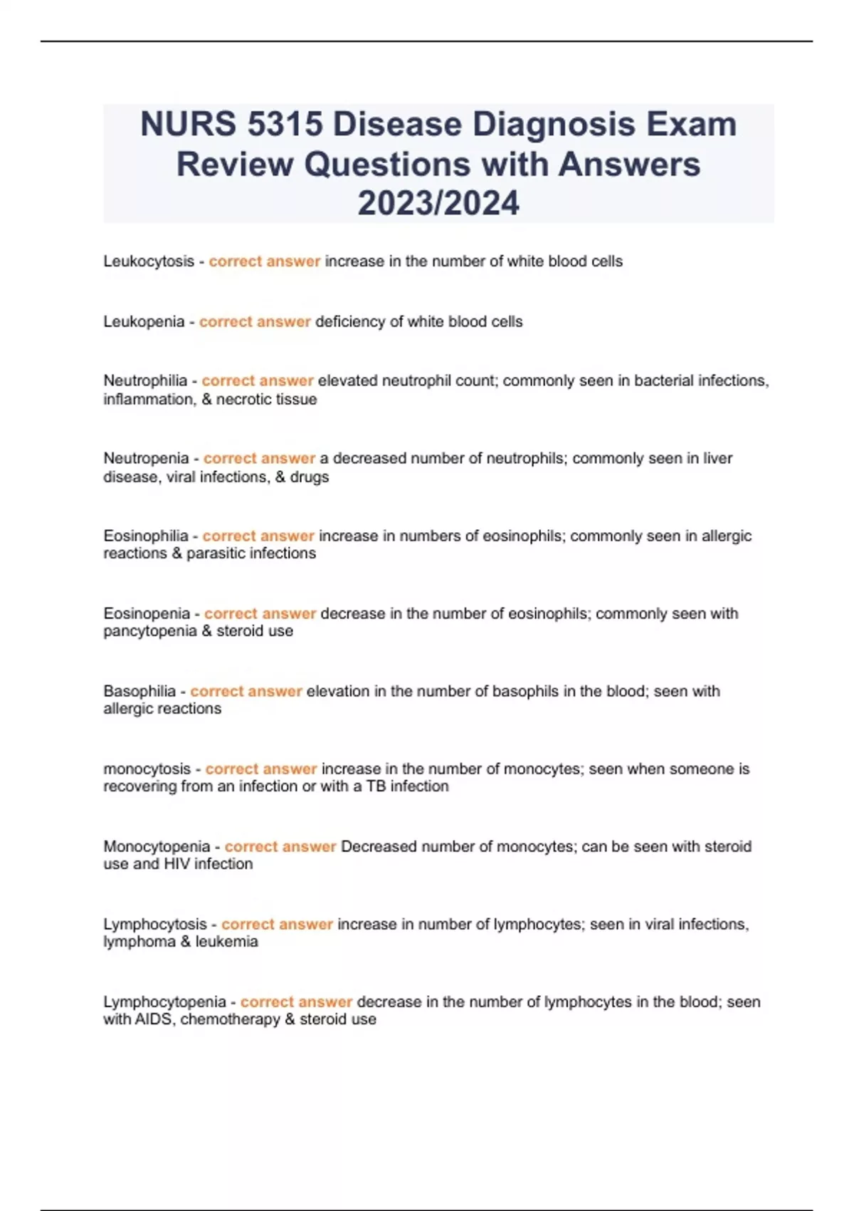 NURS 5315 Disease Diagnosis Exam Review Questions with Answers 2023/2024 Leukocytosis - correct answer increase in the number of white blood cells Leukopenia - correct answer deficiency of white blood cells Neutrophilia - correct answer elevated neutrophil count; commonly seen in bacterial infections, inflammation, & necrotic tissue Neutropenia - correct answer a decreased number of neutrophils; commonly seen in liver disease, viral infections, & drugs Eosinophilia - correct answer increase in numbers of eosinophils; commonly seen in allergic reactions & parasitic infections Eosinopenia - correct answer decrease in the number of eosinophils; commonly seen with pancytopenia & steroid use Basophilia - correct answer elevation in the number of basophils in the blood; seen with allergic reactions monocytosis - correct answer increase in the number of monocytes; seen when someone is recovering from an infection or with a TB infection Monocytopenia - correct answer Decreased number of monocytes; can be seen with steroid use and HIV infection Lymphocytosis - correct answer increase in number of lymphocytes; seen in viral infections, lymphoma & leukemia Lymphocytopenia - correct answer decrease in the number of lymphocytes in the blood; seen with AIDS, chemotherapy & steroid use Leukemia - correct answer malignant disorder of the blood and blood forming organs Acute Lymphocytic Leukemia (ALL) - correct answer P: marked by > 30% of lymphoblasts in the blood or bone marrow Age of onset: most common in children but is seen in adults S/S: fever, pallor, bleeding, fatigue, lymphadenopathy, infection, joint pain, splenomegaly, hepatomegaly, night sweats, weight loss, anemia, thrombocytopenia, petechiae and eechymosis Prognosis: survival rate decreases with age Acute Myelogenous Leukemia (AML) - correct answer P: marked by a proliferation of immature myeloid cells, decreased apoptosis and a lack of cellular differentiation. It is aggressive and fast-growing. Age of onset: most common adult leukemia; incidence increases with age. Prognosis: remission rates are inversely r/t age