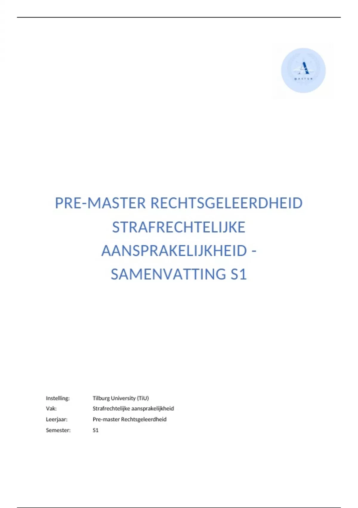 Leerjaar: Pre-master Rechtsgeleerdheid