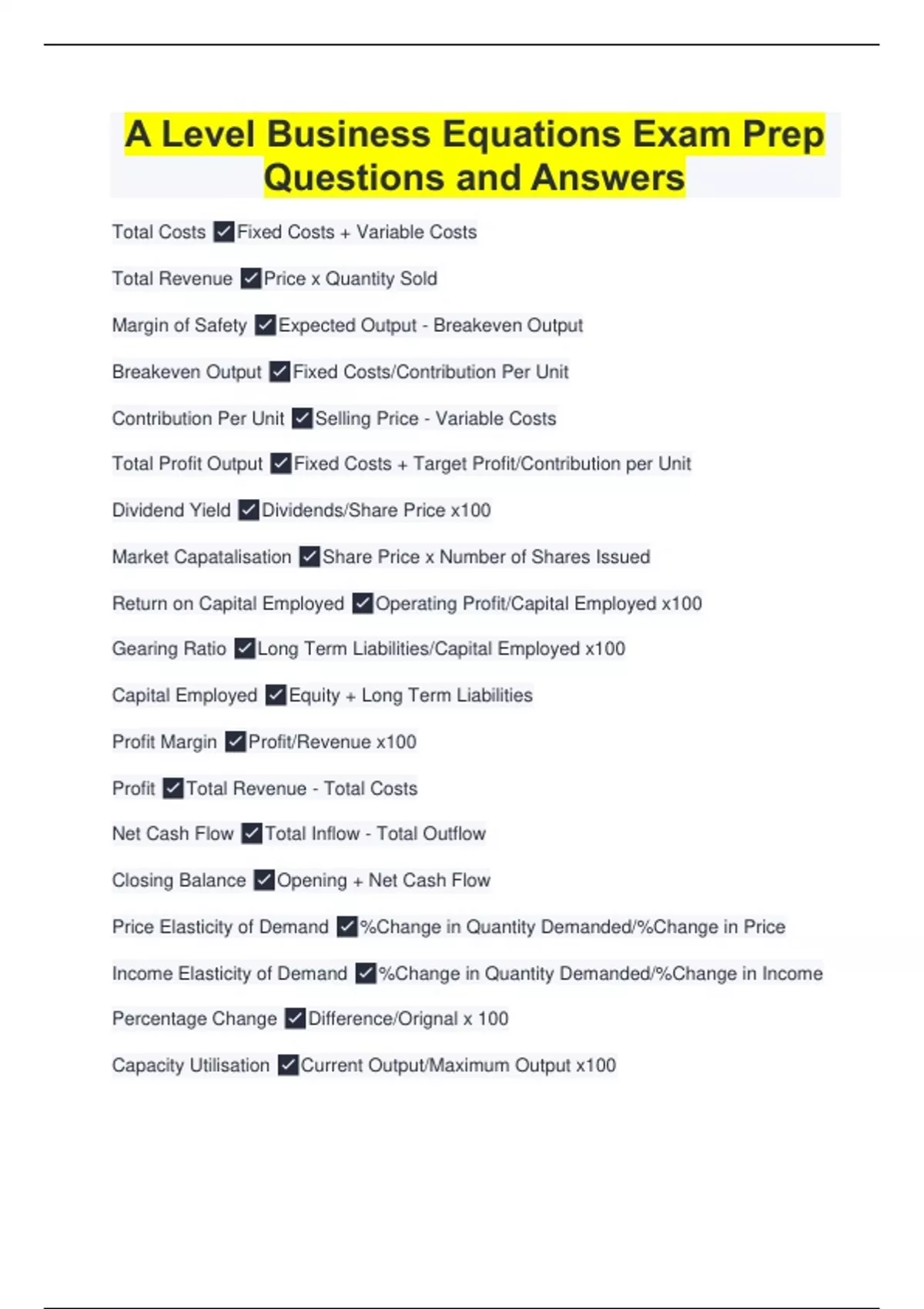 Total Costs Fixed Costs + Variable Costs Total Revenue Price x Quantity Sold Margin of Safety Expected Output - Breakeven Output Breakeven Output Fixed Costs/Contribution Per Unit Contribution Per Unit Selling Price - Variable Costs Total Profit Output Fixed Costs + Target Profit/Contribution per Unit