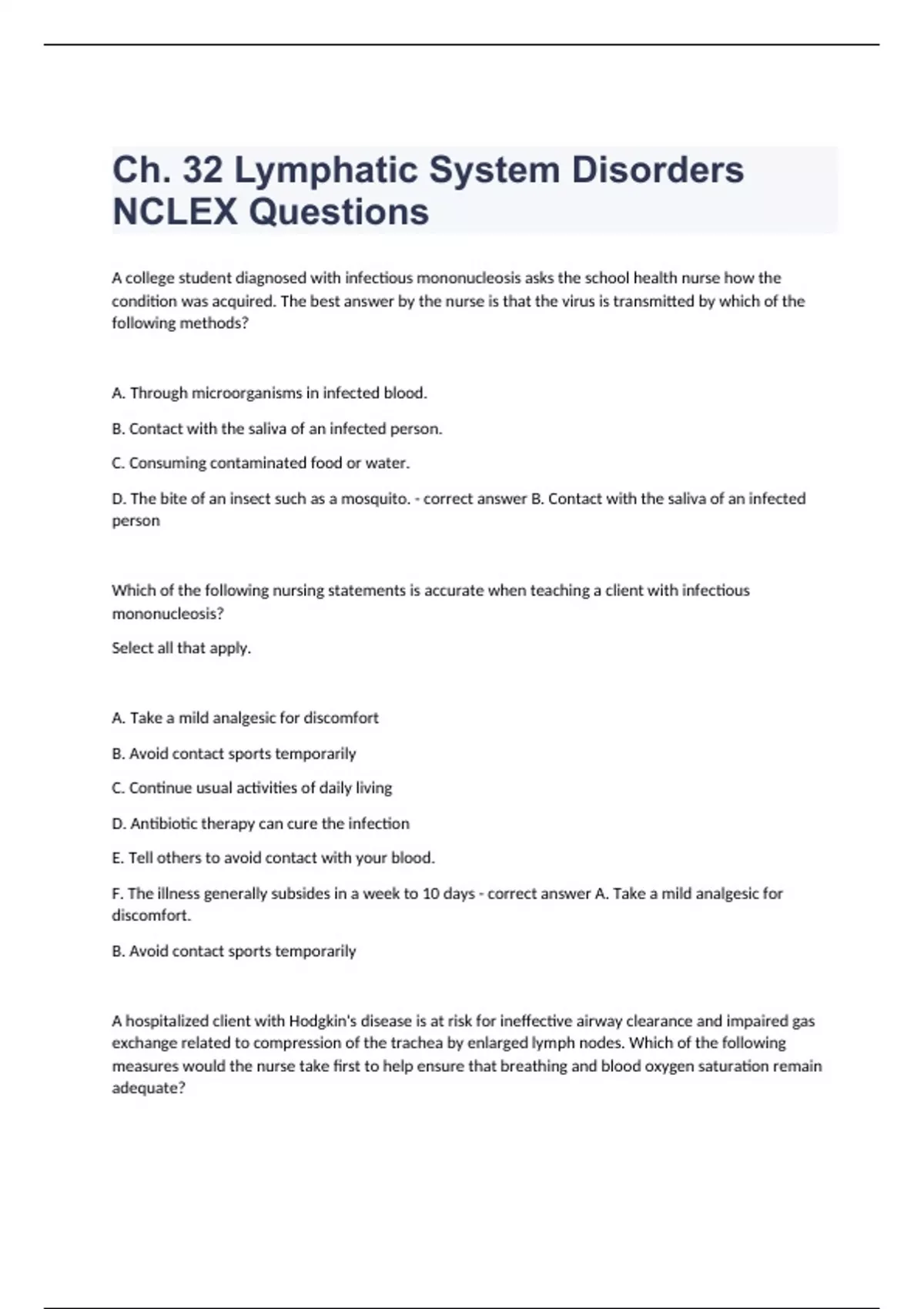 Ch. 32 Lymphatic System Disorders NCLEX Questions and answers rated A+ 2023/2024 A college student diagnosed with infectious mononucleosis asks the school health nurse how the condition was acquired. The best answer by the nurse is that the virus is transmitted by which of the following methods? A. Through microorganisms in infected blood. B. Contact with the saliva of an infected person. C. Consuming contaminated food or water. D. The bite of an insect such as a mosquito. - correct answer B. Contact with the saliva of an infected person Which of the following nursing statements is accurate when teaching a client with infectious mononucleosis? Select all that apply. A. Take a mild analgesic for discomfort B. Avoid contact sports temporarily C. Continue usual activities of daily living D. Antibiotic therapy can cure the infection E. Tell others to avoid contact with your blood. F. The illness generally subsides in a week to 10 days - correct answer A. Take a mild analgesic for discomfort. B. Avoid contact sports temporarily A hospitalized client with Hodgkin's disease is at risk for ineffective airway clearance and impaired gas exchange related to compression of the trachea by enlarged lymph nodes. Which of the following measures would the nurse take first to help ensure that breathing and blood oxygen saturation remain adequate?